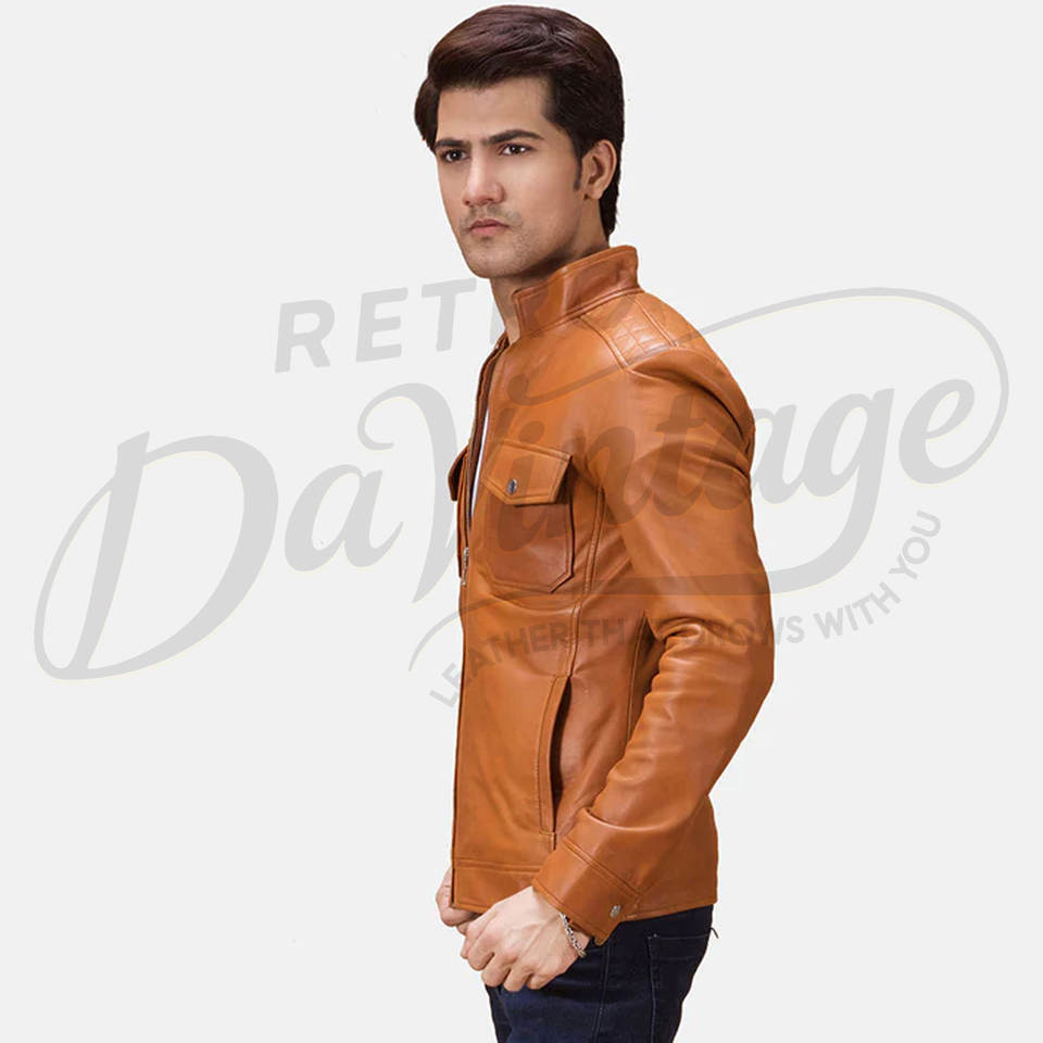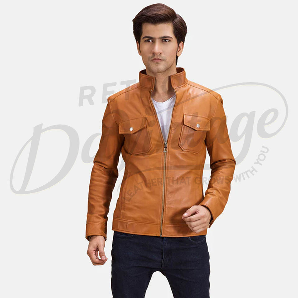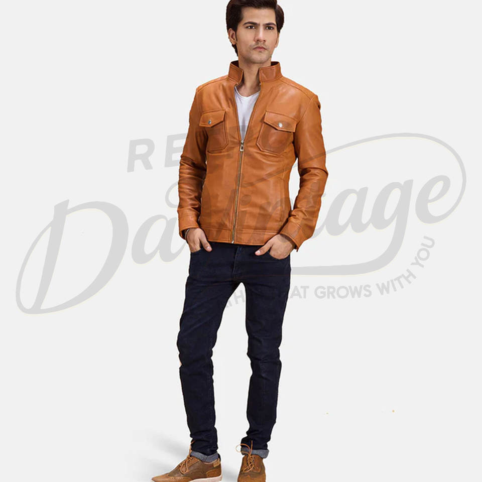 เสื้อแจ็คเก็ตหนังแท้สีน้ำตาลอูฐสำหรับผู้ชาย ทรงเข้ารูป คอตั้ง ซิปหน้า มีกระเป๋าหลายช่อง ผลิตจากหนังแกะแท้