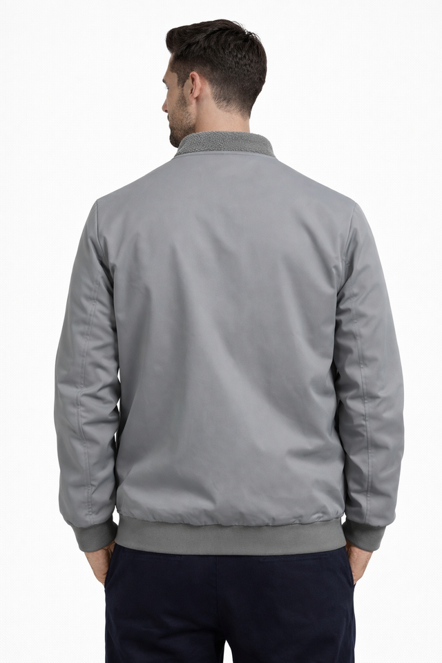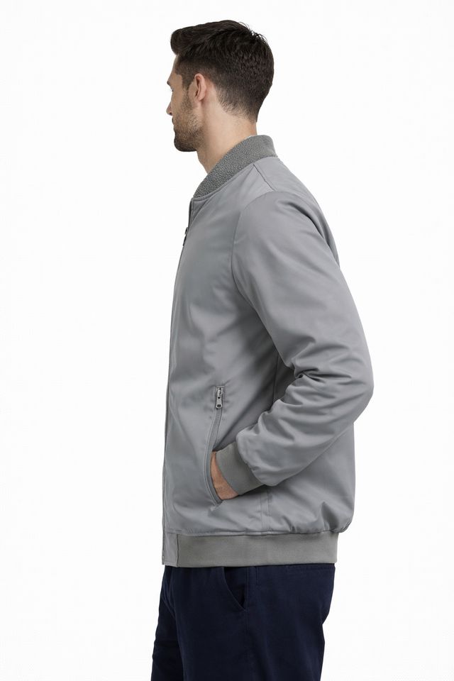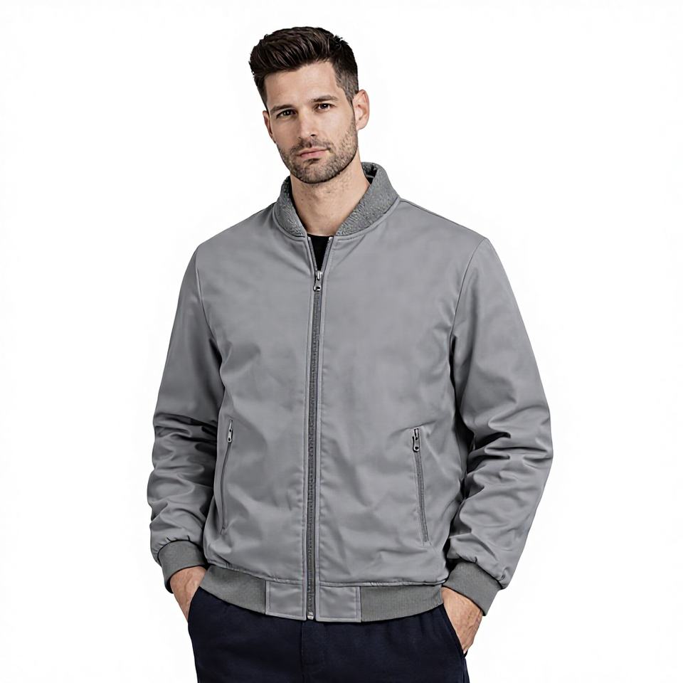 เสื้อแจ็คเก็ตบอมเบอร์สีเทาพรีเมียมสำหรับผู้ชาย คอปกผ้าฟลีซอุ่นสบาย ซิปหน้า สวมใส่สบายในฤดูหนาว ทรงเข้ารูป น้ำหนักเบา กันลม ดีไซน์ทันสมัย