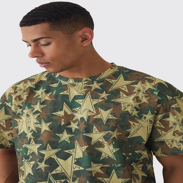 เสื้อยืดผู้ชายคุณภาพพรีเมียม ผ้าฝ้าย 100% พิมพ์ลายดาวลายพราง แห้งเร็ว ทรงโอเวอร์ไซส์ คอเสื้อยาวพิเศษ กระชับพอดีตัว เป็นมิตรต่อสิ่งแวดล้อม