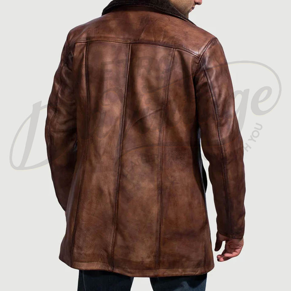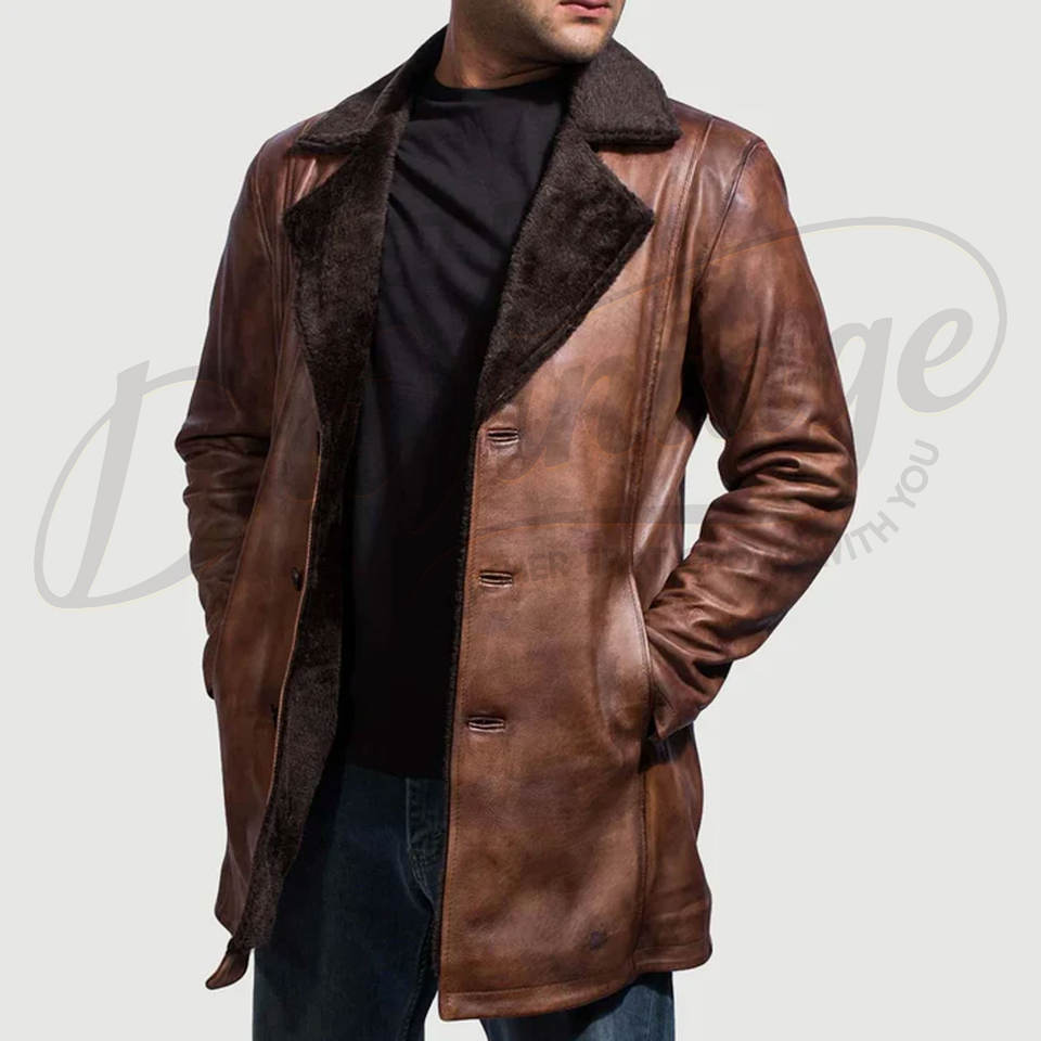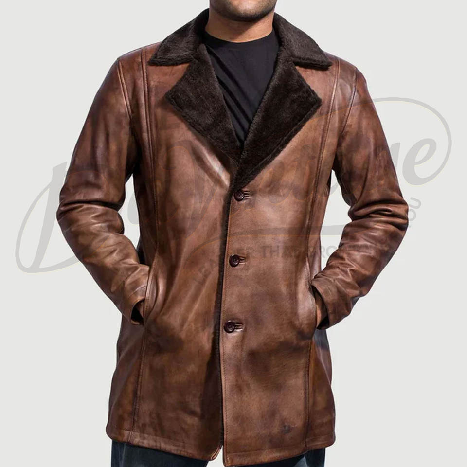 เสื้อโค้ทหนังแท้สีน้ำตาลวินเทจพรีเมียมสำหรับผู้ชาย - แจ็คเก็ตหนังแกะสำหรับฤดูหนาวความยาวปานกลางพร้อมปกขนเฟอร์เทียม
