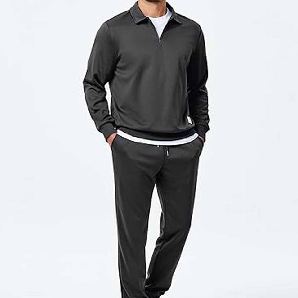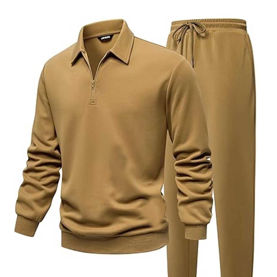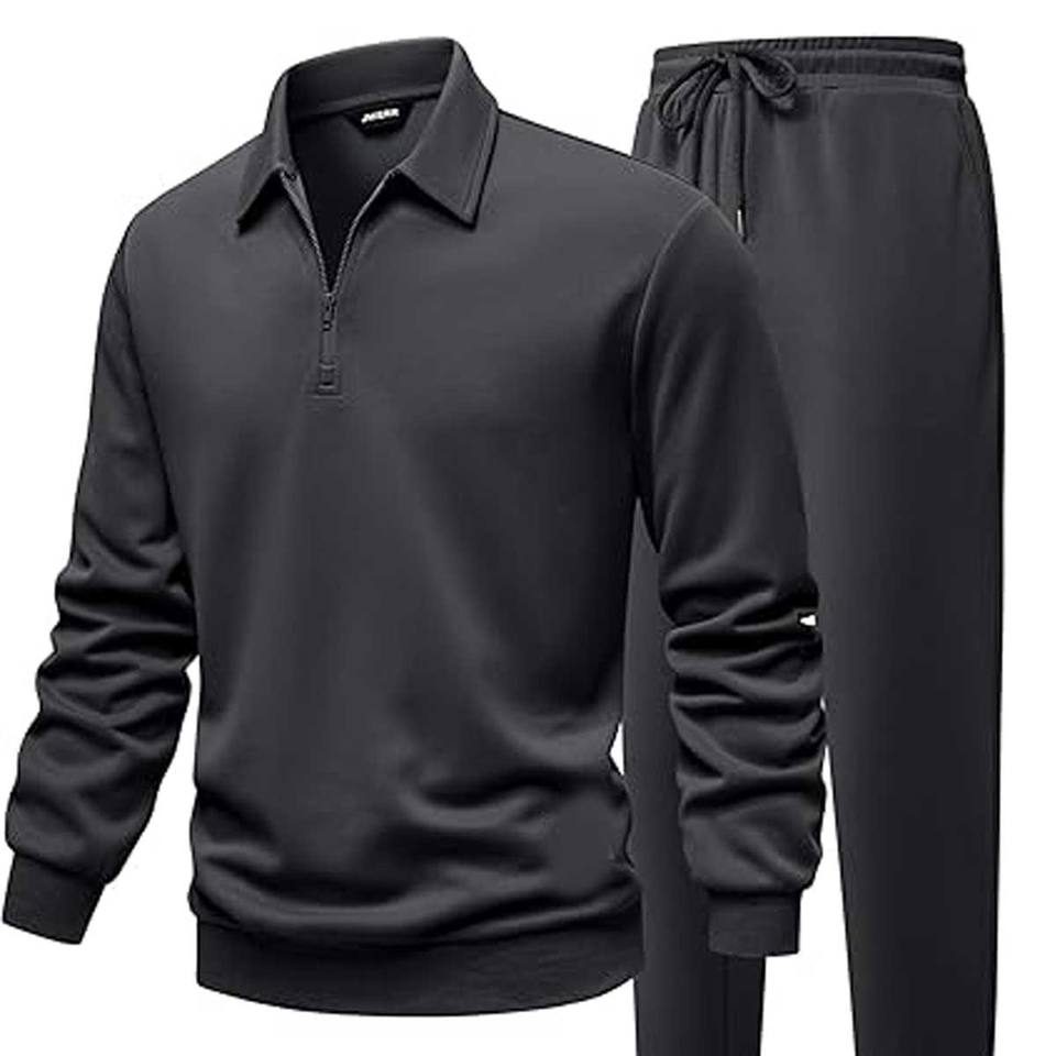 ชุดวอร์มลำลองพิมพ์ลายสำหรับผู้ชายแบบ 2 ชิ้น ประกอบด้วยเสื้อแจ็คเก็ตแบบซิปสี่ส่วน กางเกงวอร์มขายาว และซับในผ้าฟลีซ