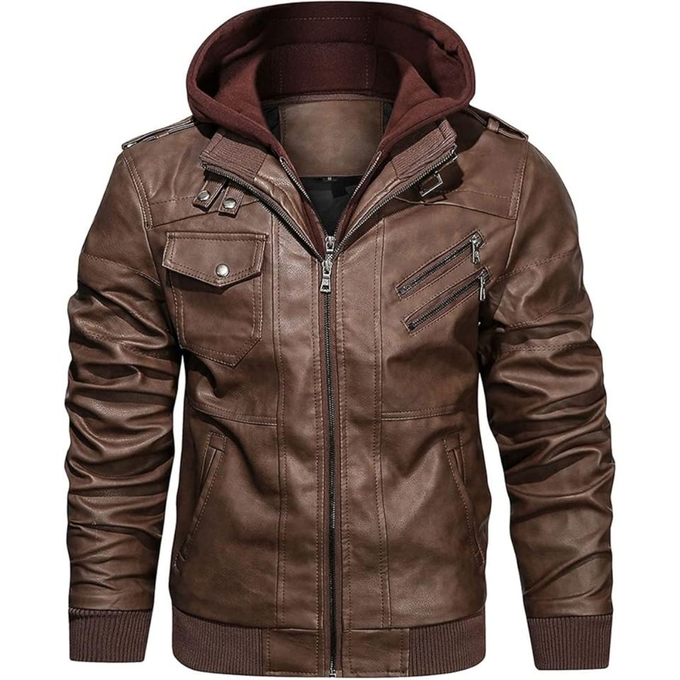แจ็กเก็ตมอเตอร์ไซค์มีฮู้ดหนัง PU สำหรับผู้ชายออกแบบมาสำหรับสไตล์ถนนที่แข็งแรงสวมใส่สบาย