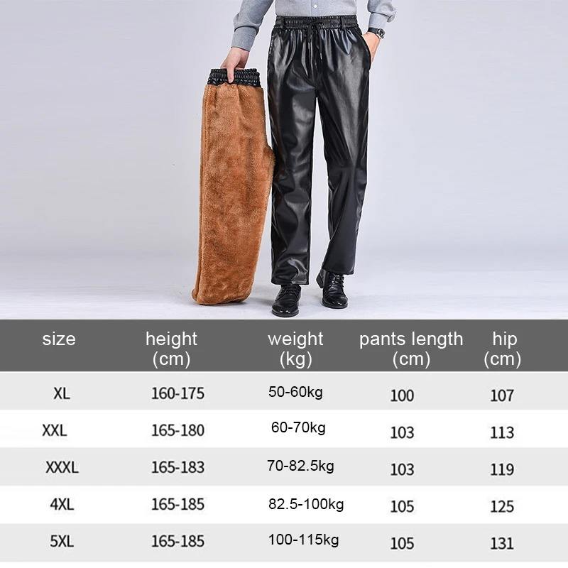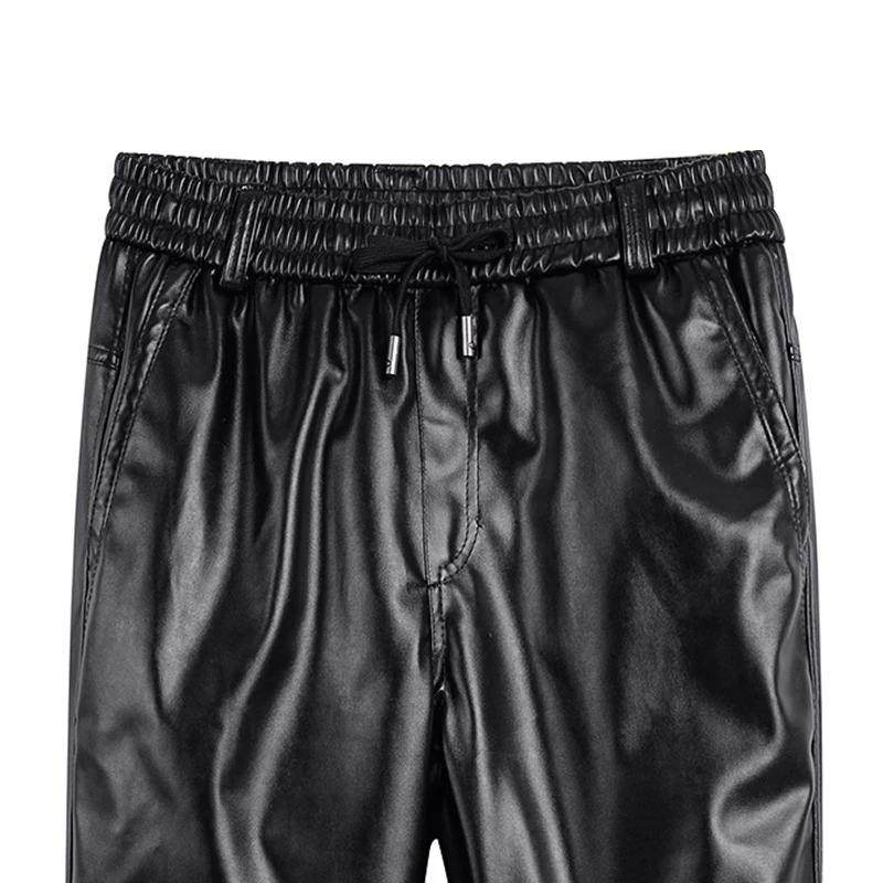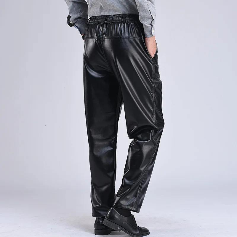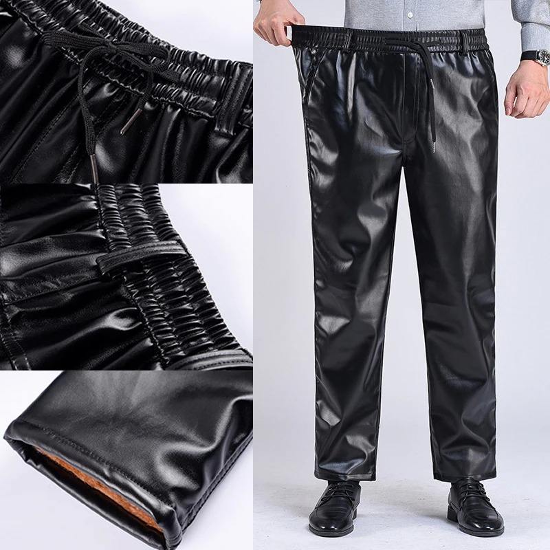 กางเกงหนัง PU สำหรับผู้ชาย, กางเกงผ้าฟลีซให้ความอบอุ่นทรงหลวมมีเชือกดึงกางเกงเรียวกางเกงนักขี่จักรยานหนังเทียมโลหะ