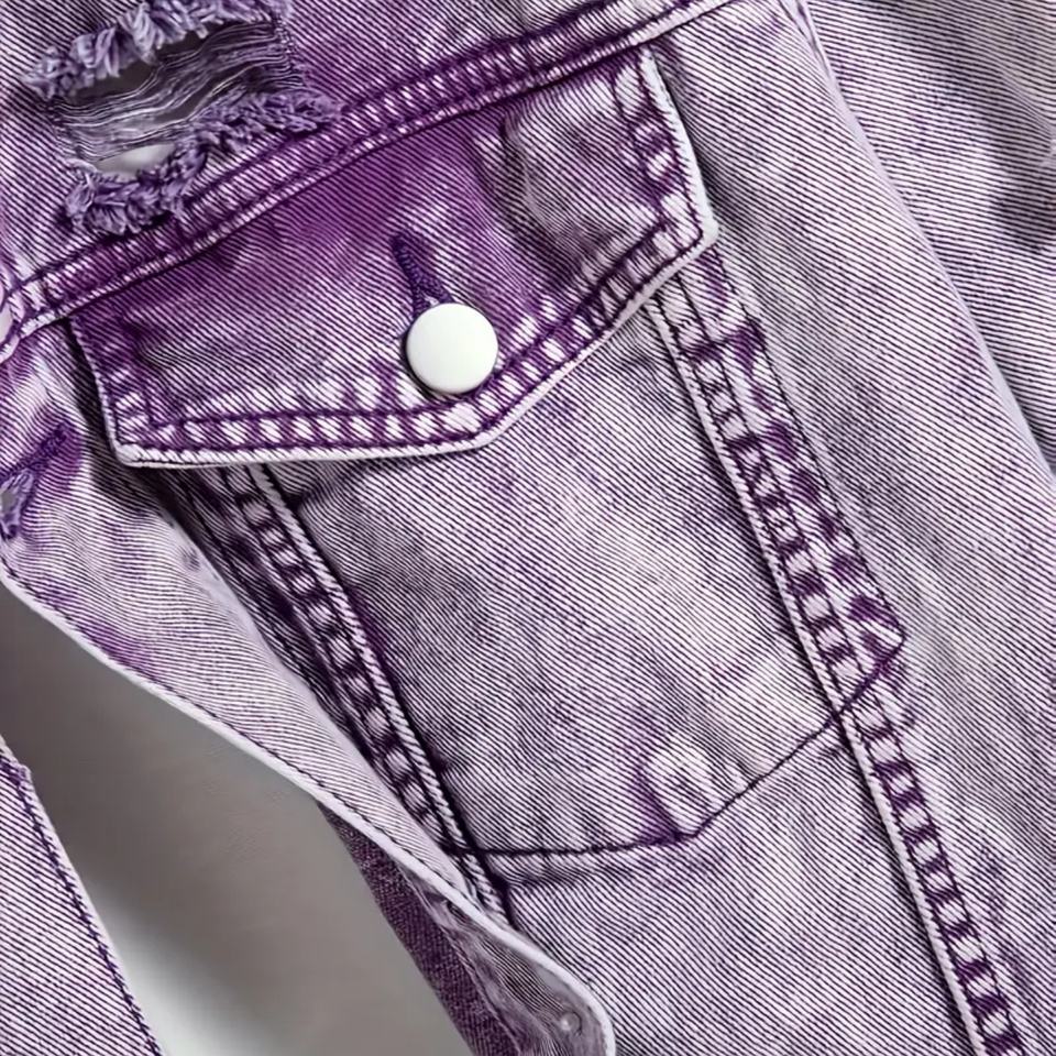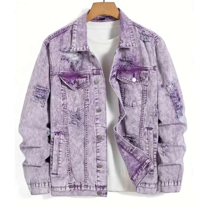 แจ็คเก็ตยีนส์สีม่วงสำหรับผู้ชาย สไตล์ลำลอง ขาดๆ แบบมีรอยขาด ติดกระดุม ปกคลาสสิก มีกระเป๋าหลายช่อง