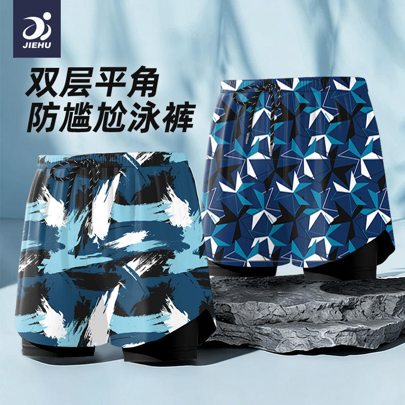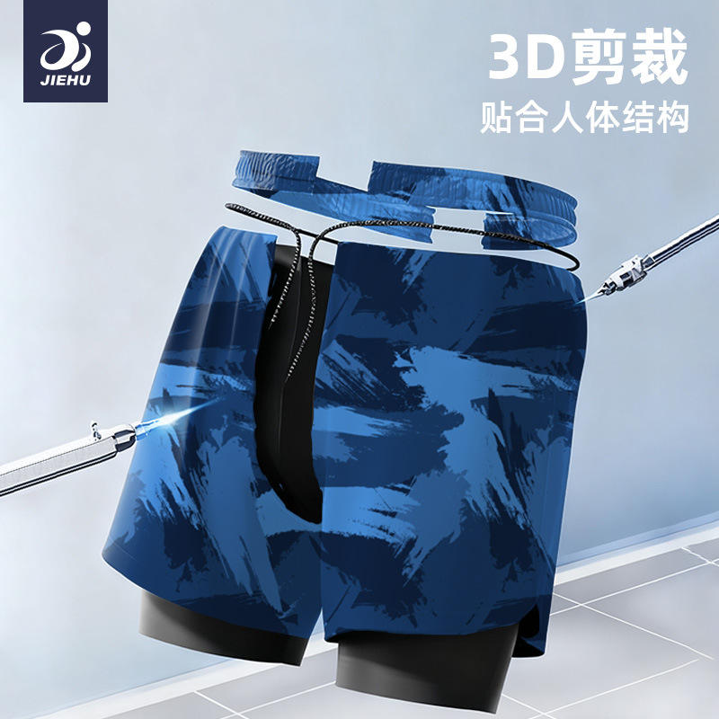 กางเกงขาสั้นชายแห้งเร็ว สีน้ำเงิน สองชั้น สำหรับวิ่ง ฟิตเนส ว่ายน้ำ ชุดกีฬาสำหรับผู้ใหญ่