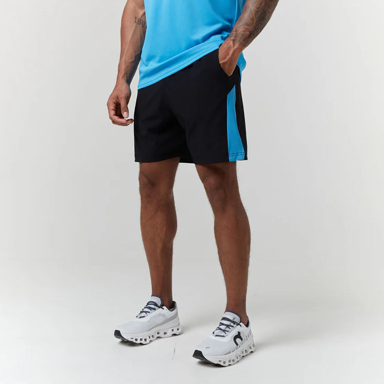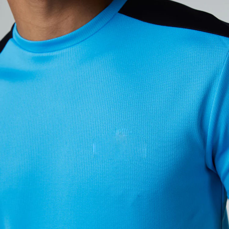 เสื้อกีฬาแขนสั้นสำหรับผู้ชายเสื้อยืดคอกลมและกางเกงขาสั้นเสื้อยืดออกกำลังกายสีตัดกันแห้งเร็ว