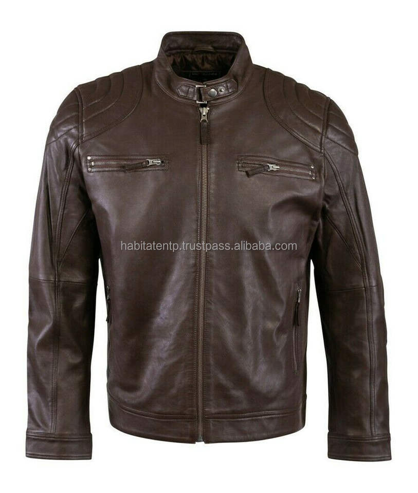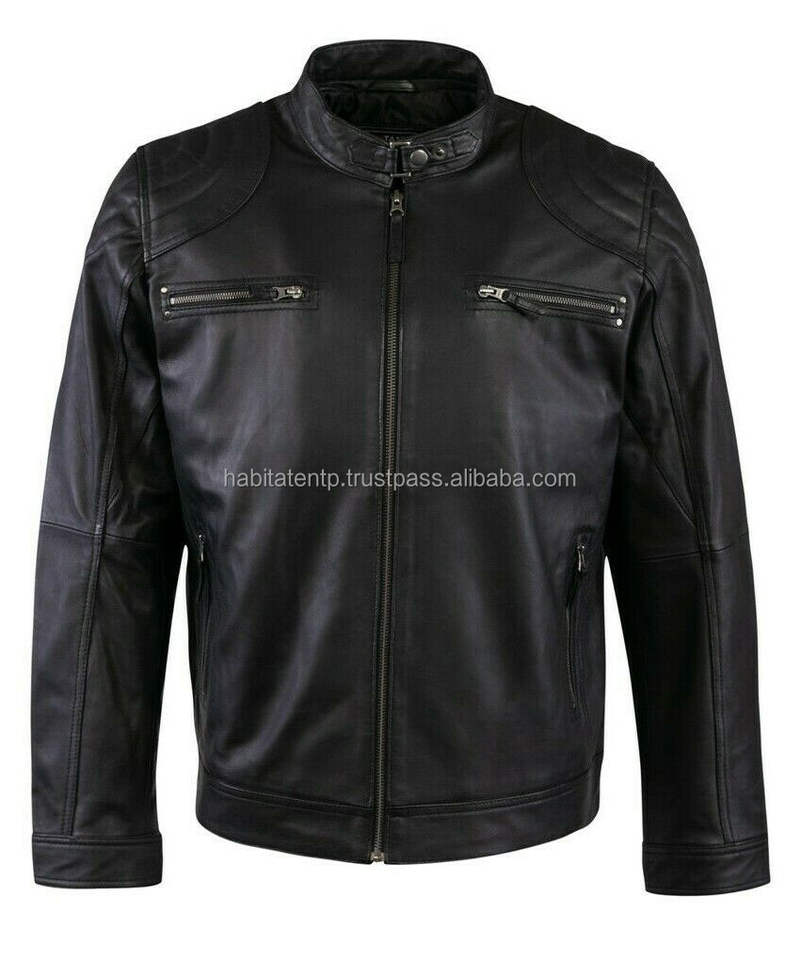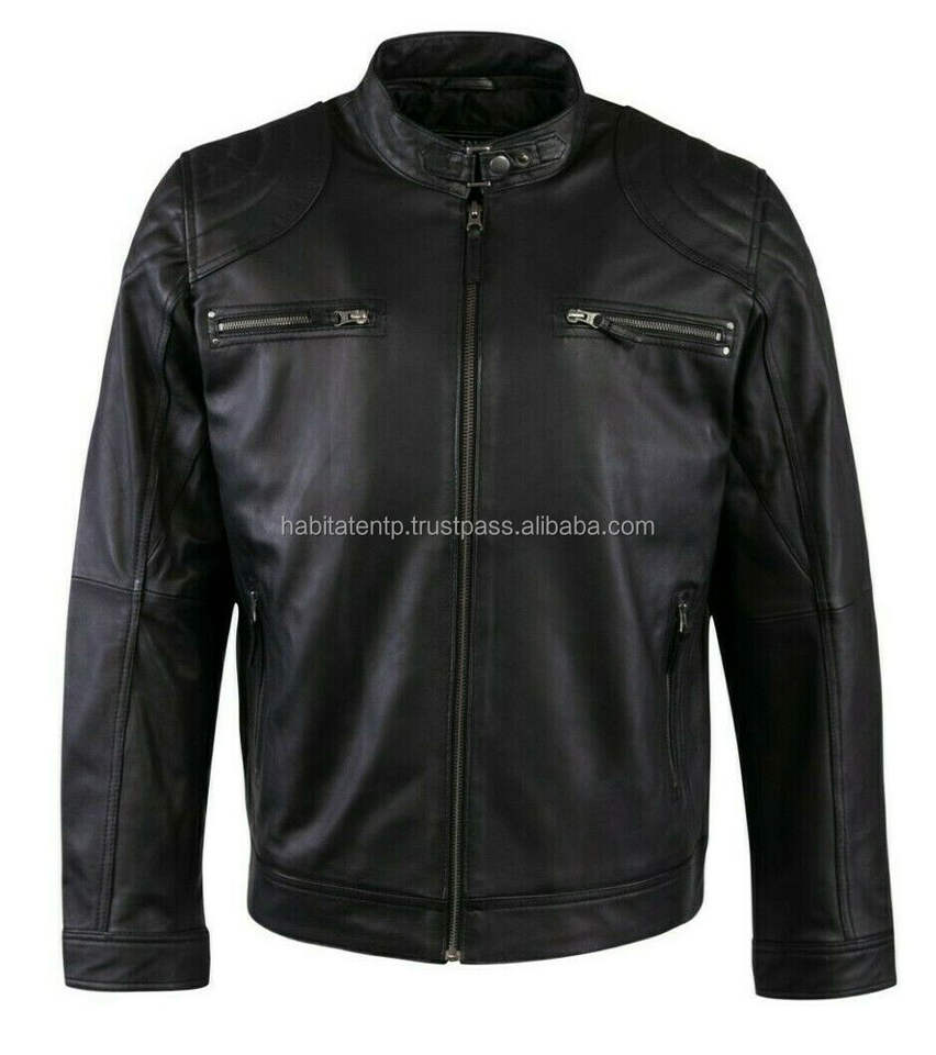 แจ็กเก็ตนักขี่จักรยานทรงสลิมฟิตสำหรับผู้ชายหนังแกะแท้เสื้อผ้าแบบเม็ดสีดำ
