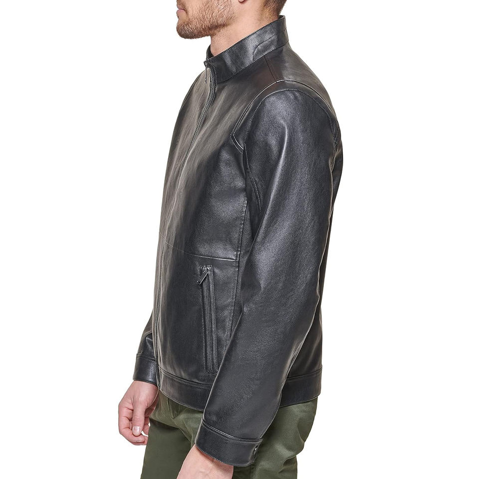 แจ็คเก็ตบอมเบอร์หนังแท้สีดำสำหรับผู้ชาย รับปักโลโก้ตามสั่ง