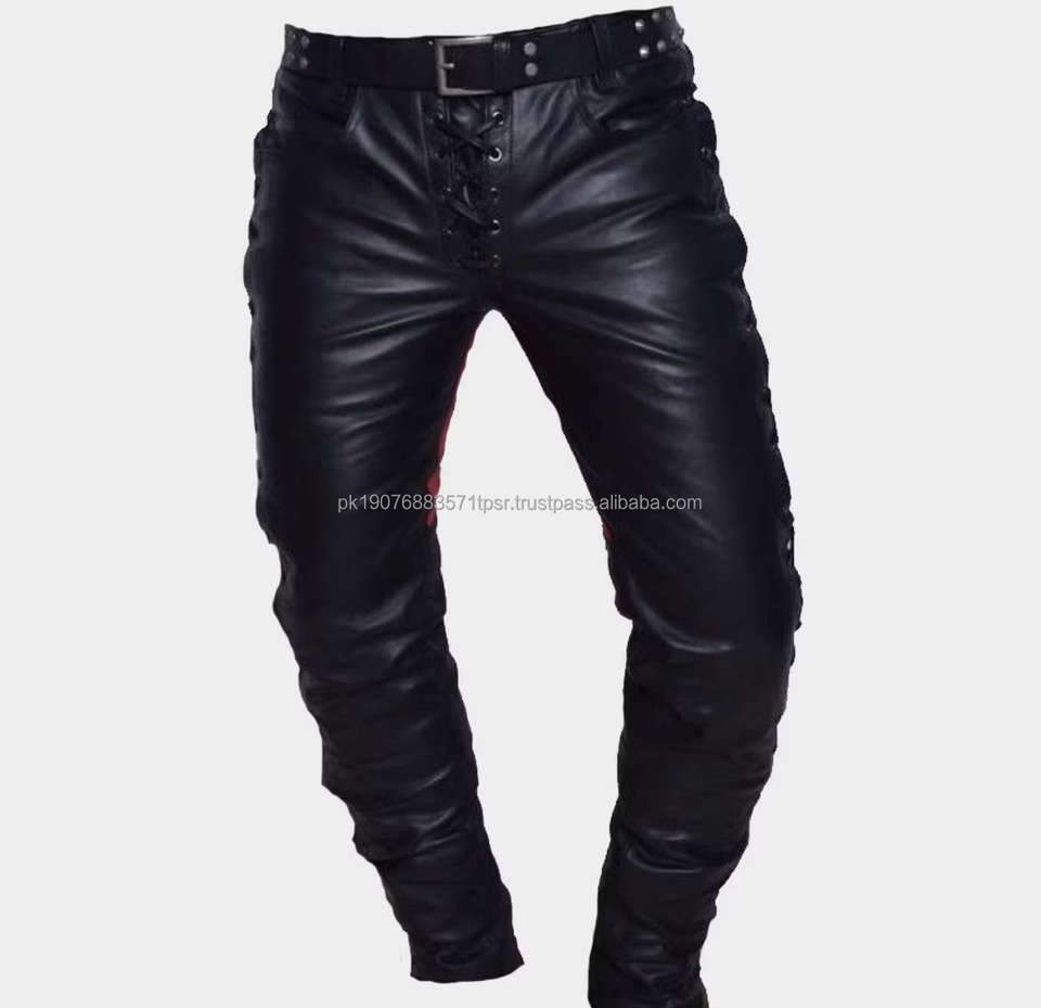 กางเกงหนังแท้ผู้ชายสไตล์ไบค์เกอร์แบบผูกเชือกทรงยีนส์