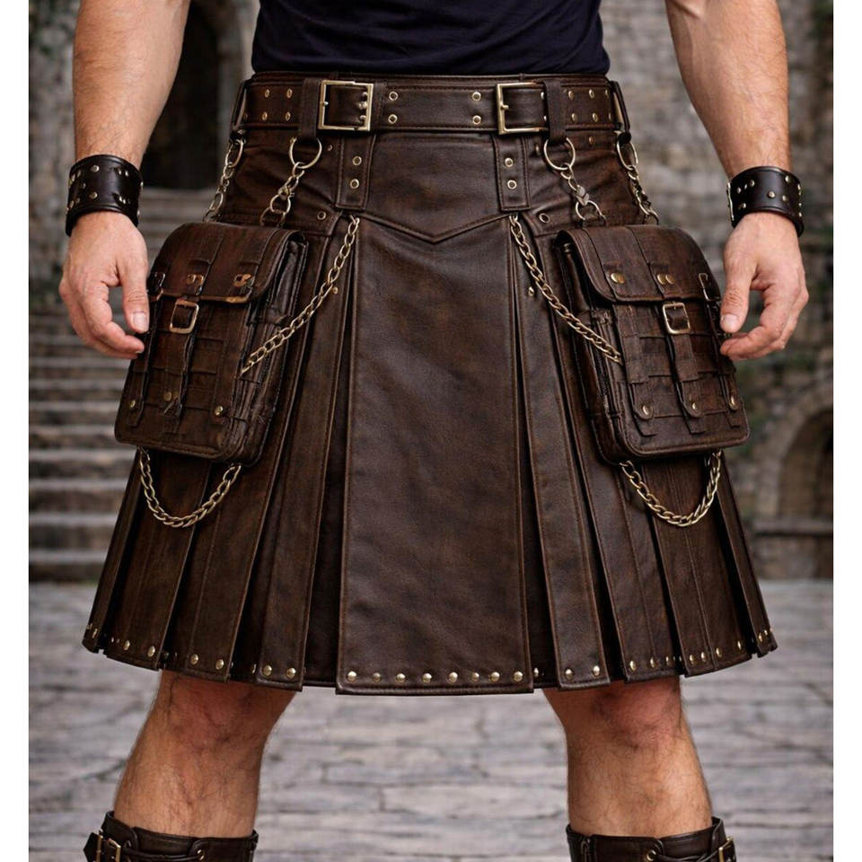 กางเกงคิลท์หนังแท้สำหรับผู้ชาย สีดำและสีน้ำตาล สไตล์โกธิคไบค์เกอร์ พร้อมกระเป๋าแบบโซ่ สำหรับงานเทศกาลและคอสเพลย์