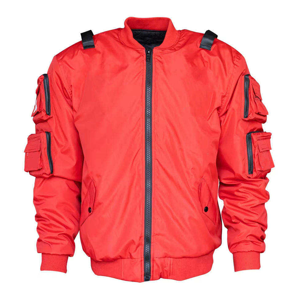 เสื้อแจ็คเก็ตเทคแวร์สีแดงสำหรับผู้ชาย แบบมีกระเป๋าหลายช่อง สไตล์สตรีทแวร์ บอมเบอร์ ไซเบอร์พังก์ ฮิปฮอป ยูทิลิตี้ คาร์โก้ กันลม