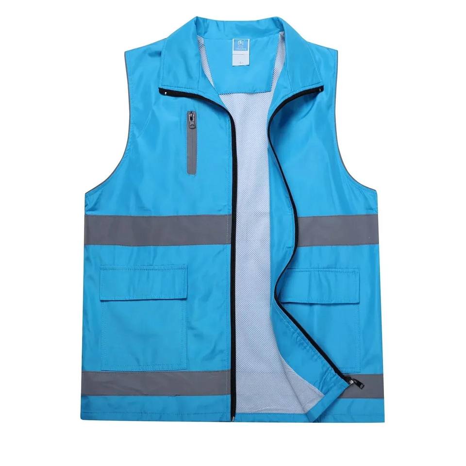 เสื้อกั๊กนิรภัยสะท้อนแสงของผู้ชายเสื้อกั๊กรักษาความปลอดภัยในการขนส่งสินค้าแขนกุดผ้าเดนิมผ้าใบขนาดพิเศษระบายอากาศผ้าฝ้าย