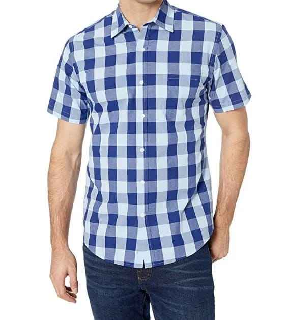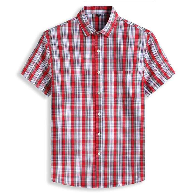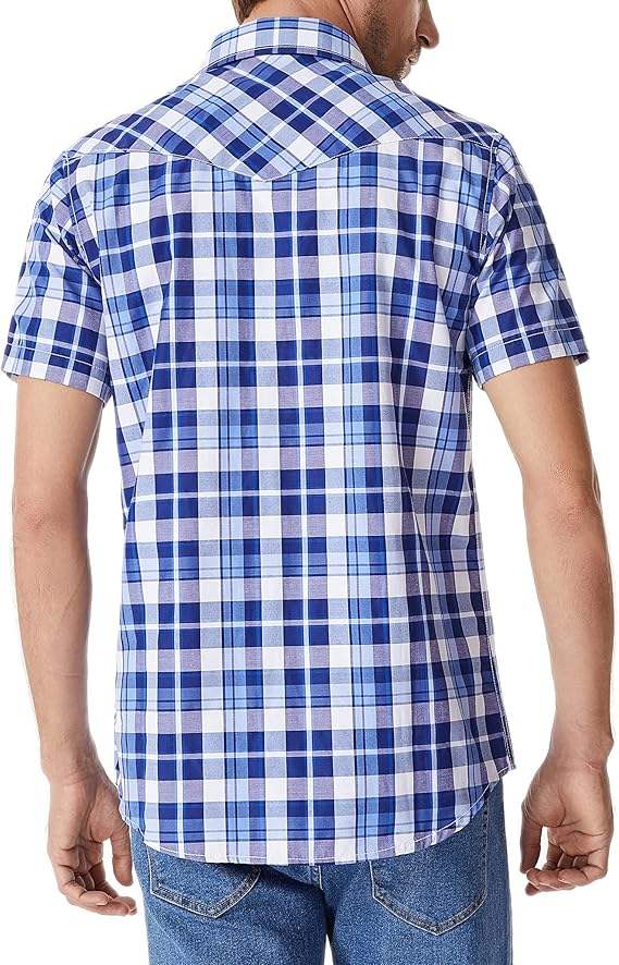 เสื้อเชิ้ตผู้ชายทรงปกติ ติดกระดุม ผ้าฝ้าย 100% ลายตารางสีน้ำเงินขาว