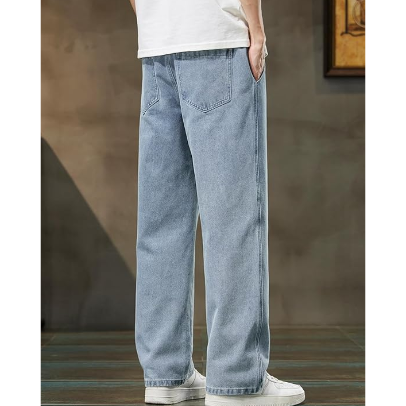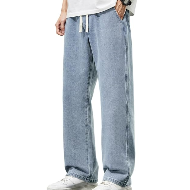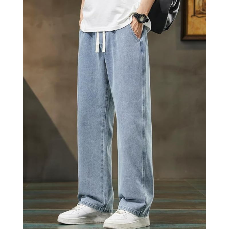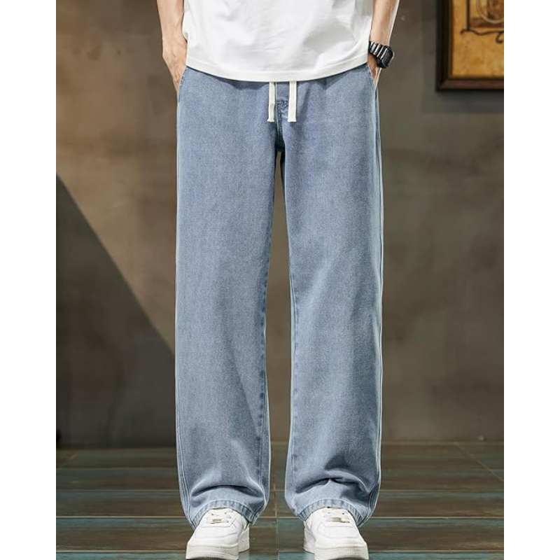กางเกงยีนส์ทรงตรงขาตรงสำหรับผู้ชาย – กางเกงยีนส์ทรงหลวมเอวยางยืดพร้อมเชือกผูกและกระเป๋าสไตล์ Y2K