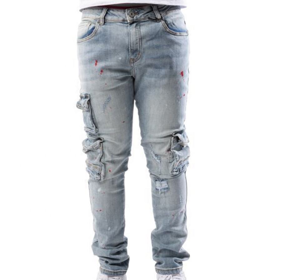 กางเกงยีนส์ทรงตรงผู้ชาย รุ่น Regular Fit ผ้ายืด ใส่สบาย เอวแบบ Comfort Flex ทรงคาร์โก้ แต่งหมุด ล้างสีแบบ Distressed ลายเรียบ