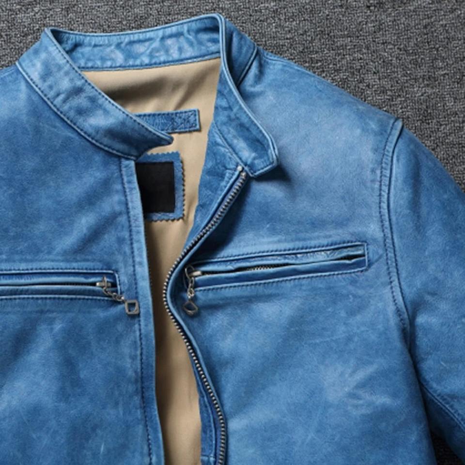 แจ็กเก็ตมอเตอร์ไซค์ย้อนยุคสำหรับผู้ชายมีซิปหนังลูกวัวนิ่มทรงสลิมฟิตเสื้อคลุมมีไส้โพลีเอสเตอร์สภาพใหม่
