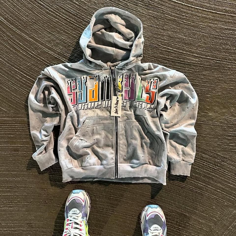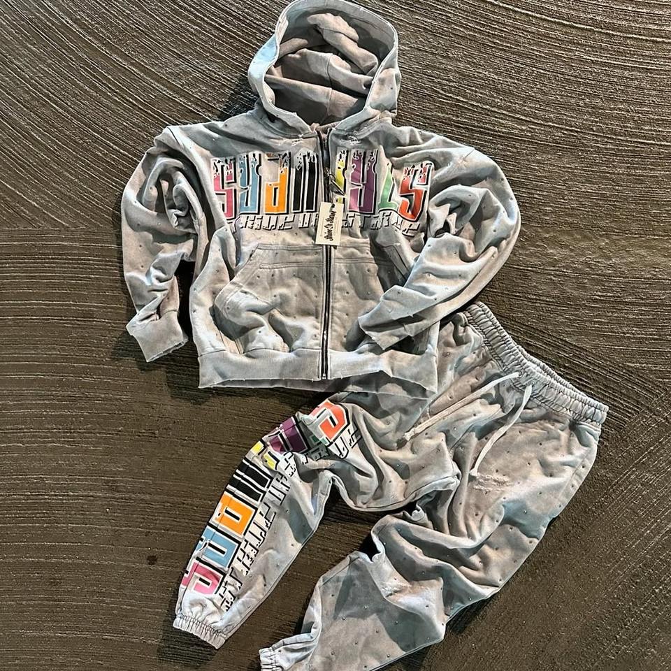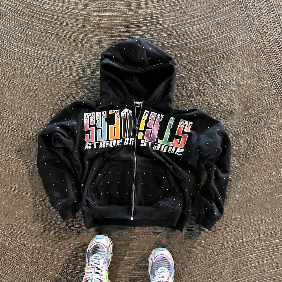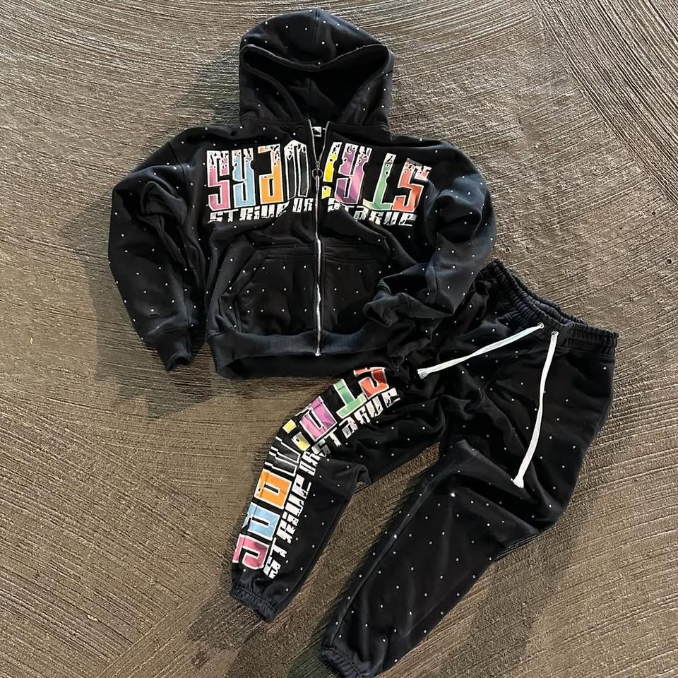 ชุดวอร์มสไตล์สตรีทย้อนยุคสำหรับผู้ชายพิมพ์ลายหน้าจอด้วยพลอยเทียมกางเกงวอร์มทั่วไปพร้อมชุดซิปแบบย้อนยุค
