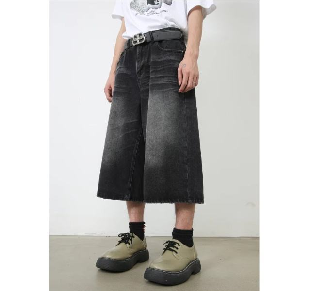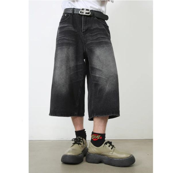 กางเกงยีนส์ขาสั้นย้อนยุคสำหรับผู้ชายกางเกงยีนส์สามส่วนขากว้างกางเกงทรงหลวมตรงกลางกางเกงทันสมัยสไตล์ลำลองสำหรับฤดูร้อน