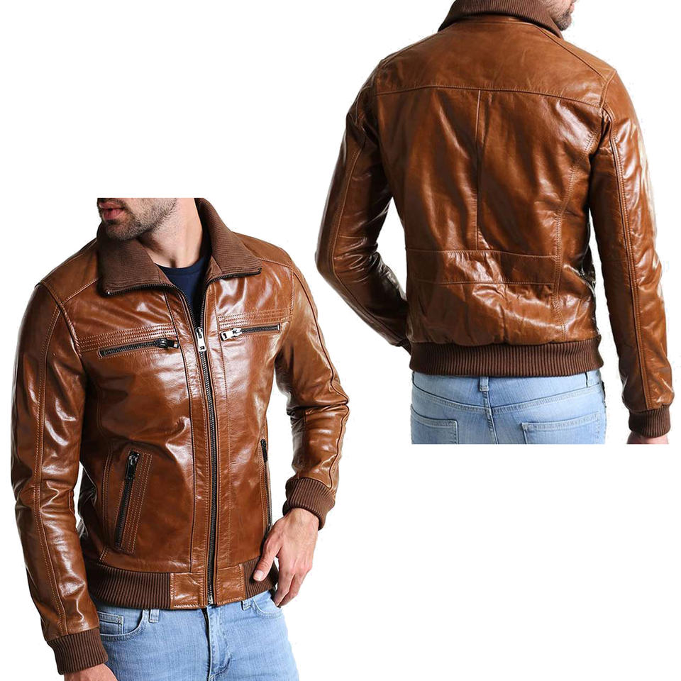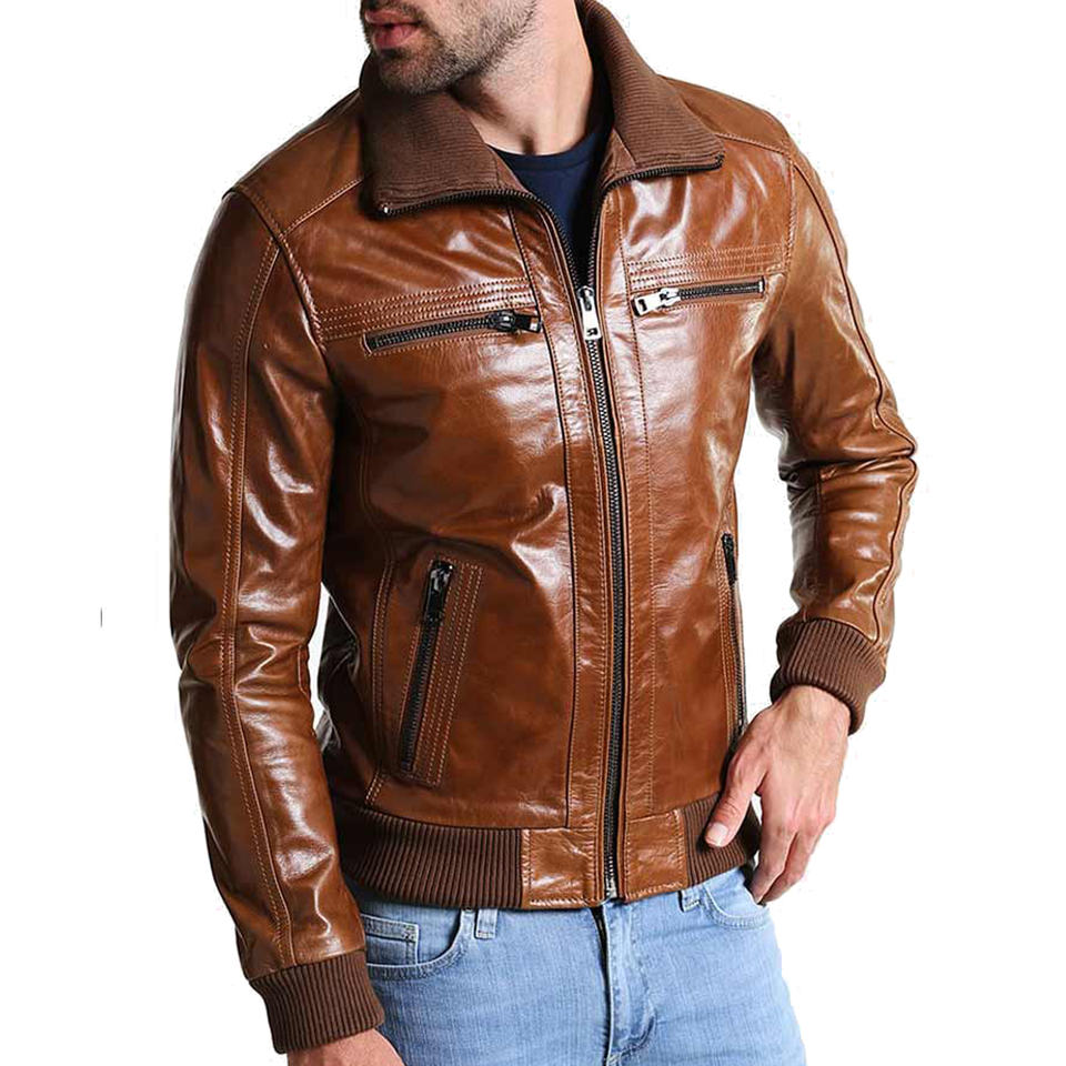 เสื้อแจ็คเก็ตบอมเบอร์ผู้ชายแบบกลับด้านได้ สำหรับฤดูหนาว หนังสีน้ำตาล ซับในวิสโคส ปิดด้วยซิป คอและปลายแขนเสื้อแบบถัก