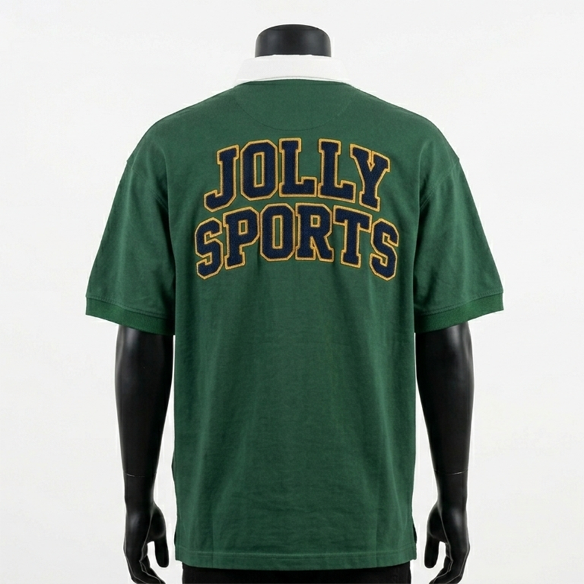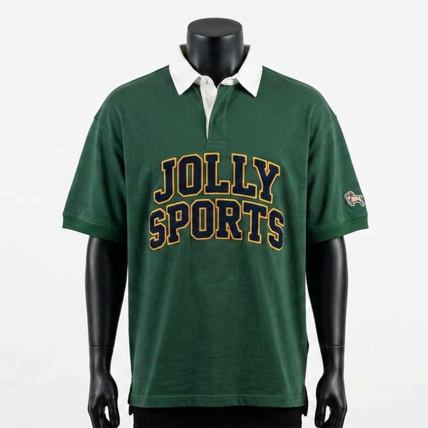 เสื้อรักบี้ชาย ผ้าคอตตอนหนา GSM ทอแบบ Pique สีเขียวเข้ม ปกสีขาว ปักโลโก้ Chenille แบบกำหนดเอง เสื้อรักบี้ชายสำหรับเสื้อโปโล