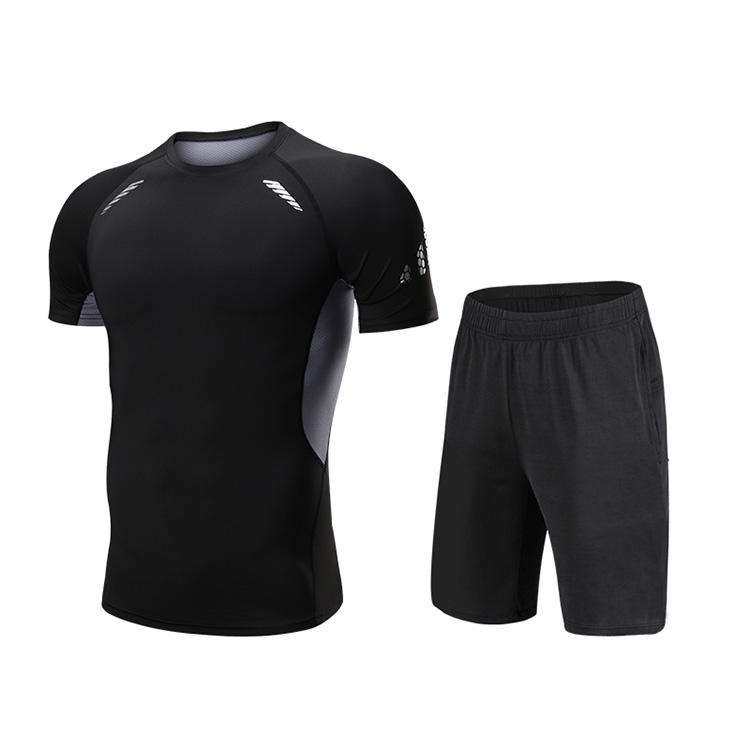 ชุดออกกำลังกายผู้ชายสำหรับฤดูร้อน เสื้อยืดและกางเกงขาสั้นสองชิ้น ระบายอากาศได้ดี ซับเหงื่อ เหมาะสำหรับวิ่ง ฟิตเนส และการฝึกซ้อม