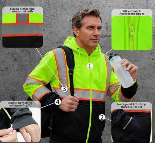 เสื้อฮู้ดสะท้อนแสงสำหรับผู้ชาย เสื้อฮู้ดซิปหน้าแบบมองเห็นได้ชัดเจน เสื้อฮู้ดนิรภัยแบบ Hi-Vis