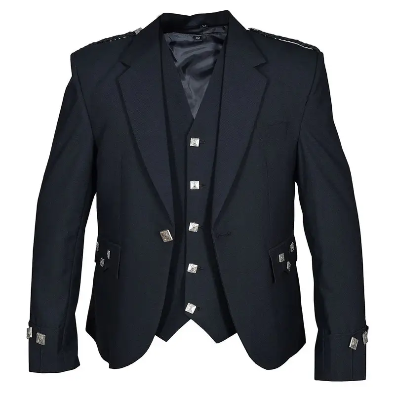 ชุดเสื้อคลุมและเสื้อกั๊กสไตล์ไฮแลนด์อาร์ไกล์สำหรับผู้ชายทุกขนาด สีดำ ผ้าขนสัตว์เซอร์จ พร้อมโลโก้สั่งทำพิเศษ อุปกรณ์เสริมสำหรับเครื่องดนตรี