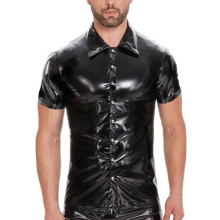 เสื้อหนังเงาสุดเซ็กซี่สำหรับผู้ชายเสื้อคอเสื้อหนังเทียมแขนสั้นเปิดลงเสื้อเชิ้ตเข้ารูปเครื่องแต่งกายสำหรับการแสดงบนเวที
