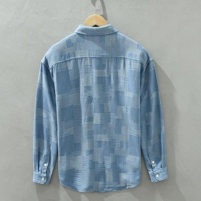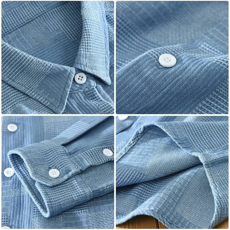 เสื้อเชิ๊ตผู้ชายแขนยาวผ้าฝ้ายติดกระดุมสำหรับใส่ทำงานลำลองโลโก้วินเทจ