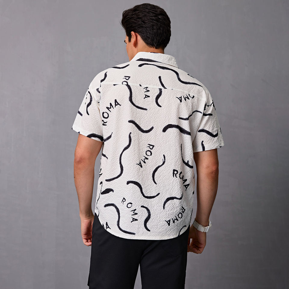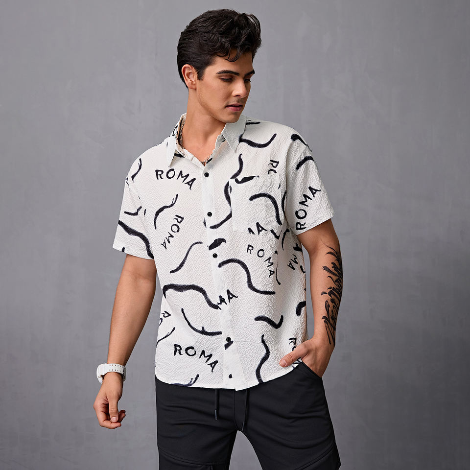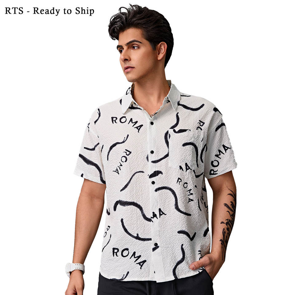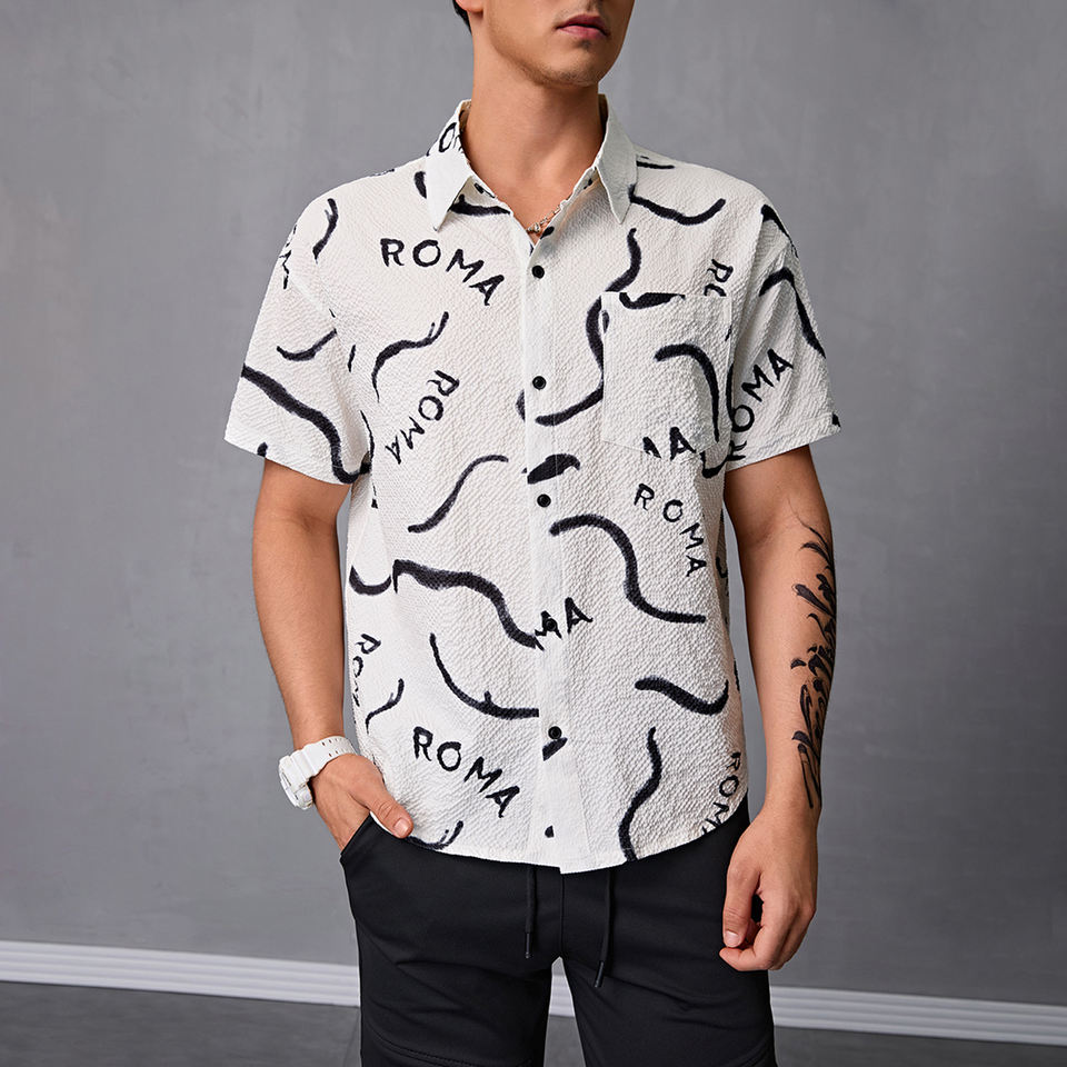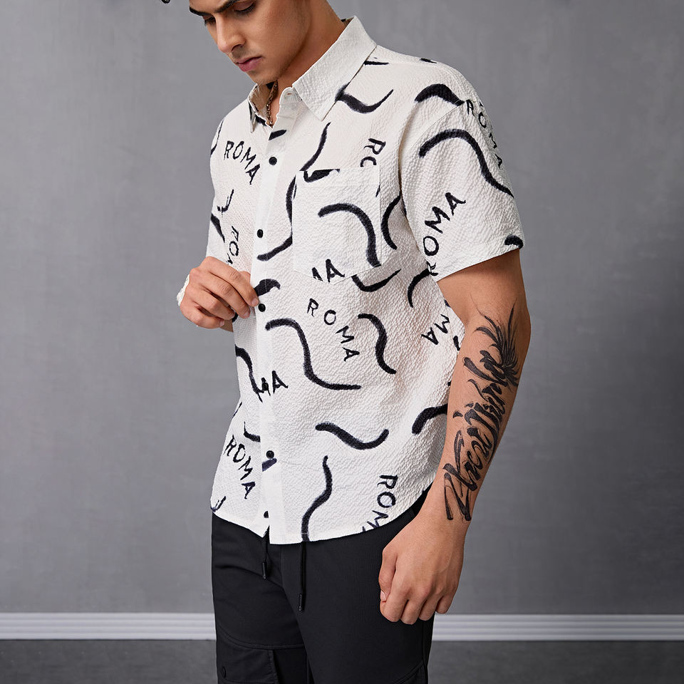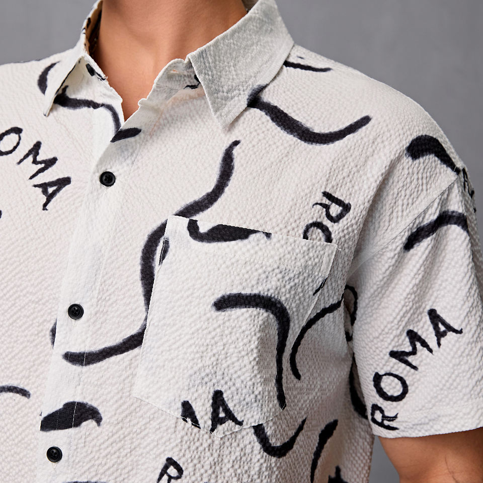 Men's Short Sleeve Printed Shirt Pleated Fabric Button Shirt With Pockets for Summer