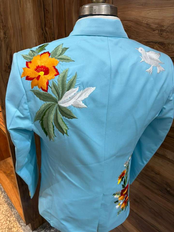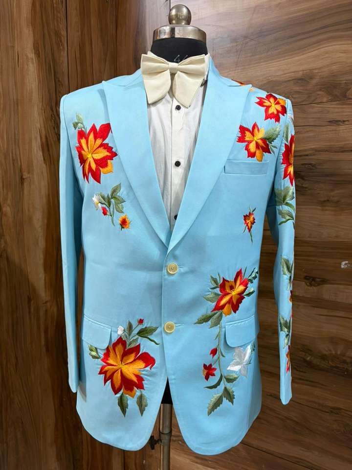 ชุดสูทคาวบอยปักลายสีฟ้าสำหรับผู้ชาย – ชุดเบลเซอร์งานแต่งงานลายดอกไม้พร้อมโบว์ไทสำหรับเจ้าบ่าวและงานปาร์ตี้