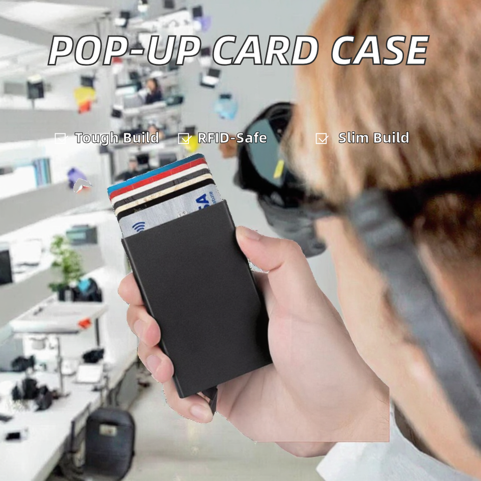 ที่ใส่บัตรแฟชั่นอะลูมิเนียมทรงเพรียวบางสำหรับผู้ชาย ป้องกัน RFID แบบอัตโนมัติ ใส่บัตรเครดิตได้ 6 ใบ กระเป๋าสตางค์ขนาดเล็กแบบไม่มีฝาปิด