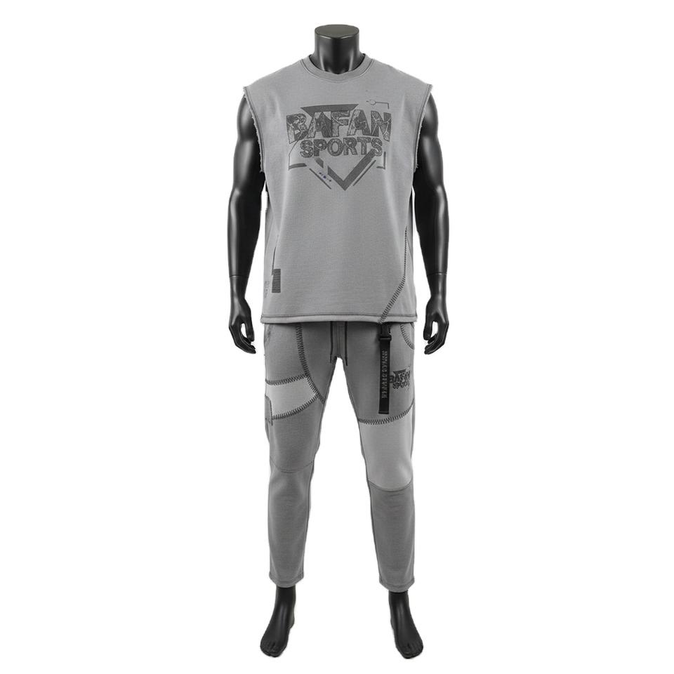 เสื้อยืดแขนกุดออกกำลังกายผู้ชายและกางเกงจ็อกเกอร์ ผ้าคอตตอนผสมโพลีเอสเตอร์ ตะเข็บแบบอินเตอร์ล็อค พิมพ์ลายโลโก้ตามสั่ง ชุด 2 ชิ้น สำหรับผู้ชาย