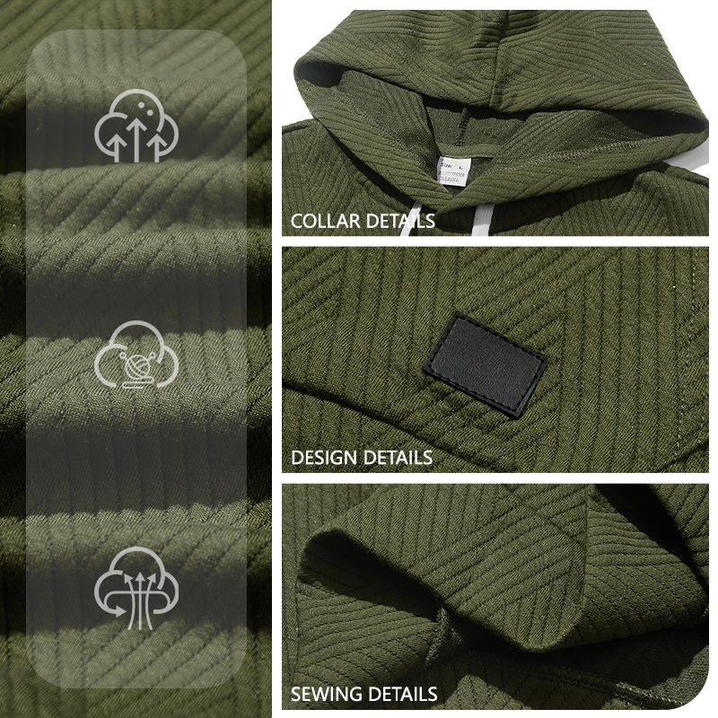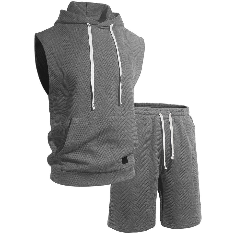 ชุดเสื้อกั๊กมีฮู้ดแขนกุดสำหรับผู้ชาย ชุดกางเกงขาสั้น สีพื้น ผ้าถักลายแจ็คการ์ด ชุดลำลองสำหรับเล่นกีฬา สีกากี ดำ เขียว เทา ขาว