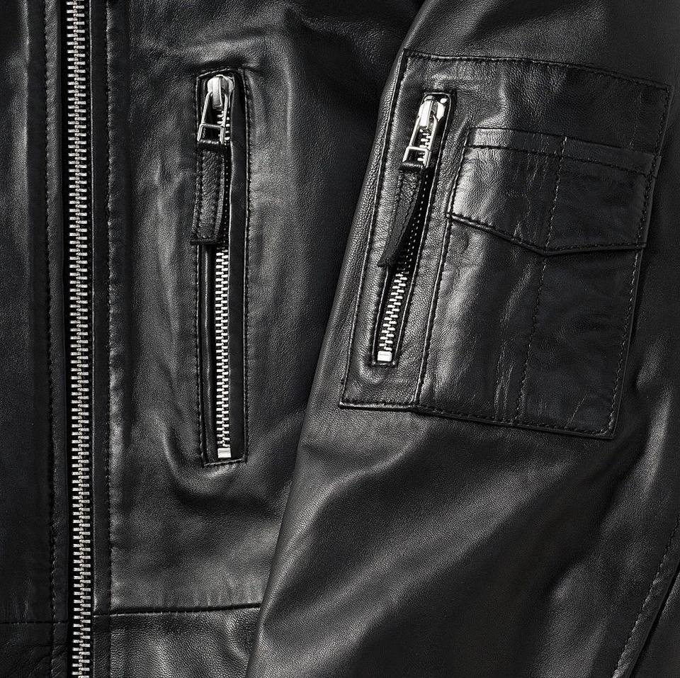 แจ็กเก็ตหนังเข้ารูปสำหรับผู้ชายบอมเบอร์ซับในผ้าวิสคอสระบายอากาศได้ดีแจ็คเก็ตไฮสตรีทซิปปิดฤดูหนาวสีดำ