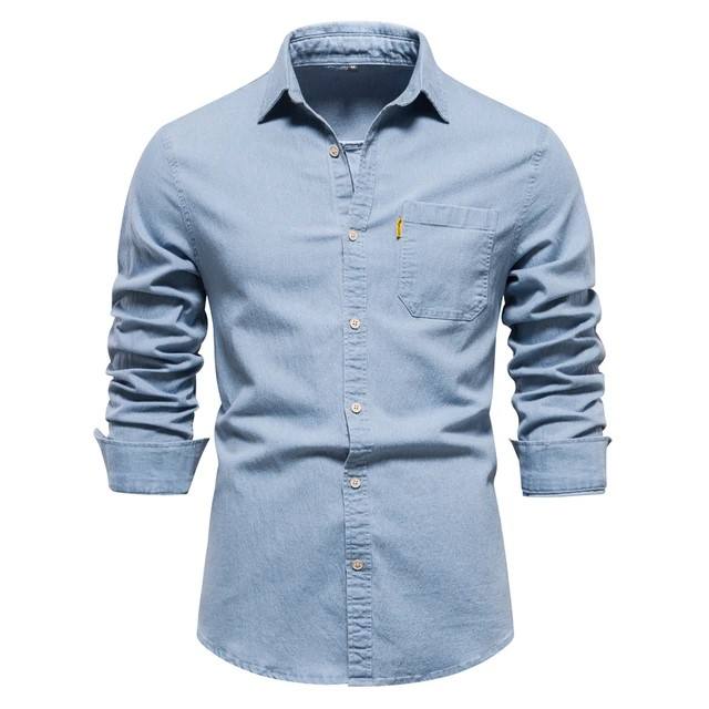 เสื้อเชิ้ตเดนิมแขนยาวทรงเข้ารูปสำหรับผู้ชาย เนื้อผ้าเบาสบาย ระบายอากาศได้ดี เป็นมิตรต่อสิ่งแวดล้อม แห้งเร็ว ผลิตจากผ้าฝ้ายผสมสแปนเด็กซ์ ปรับแต่งได้ เหมาะสำหรับฤดูร้อน