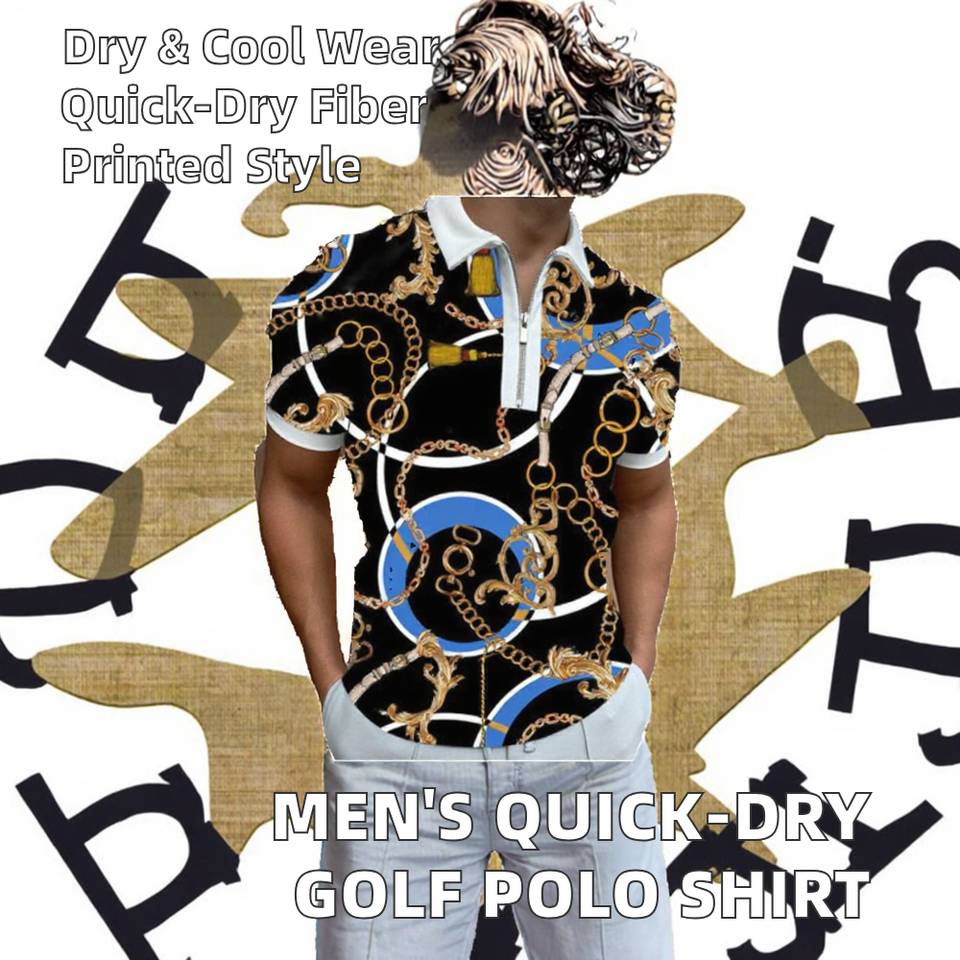 เสื้อกอล์ฟและเทนนิสแขนสั้นเข้ารูปสำหรับผู้ชายเสื้อโปโลแบบแห้งเร็วระบายอากาศได้ดีมีซิปรูดพิมพ์ลาย