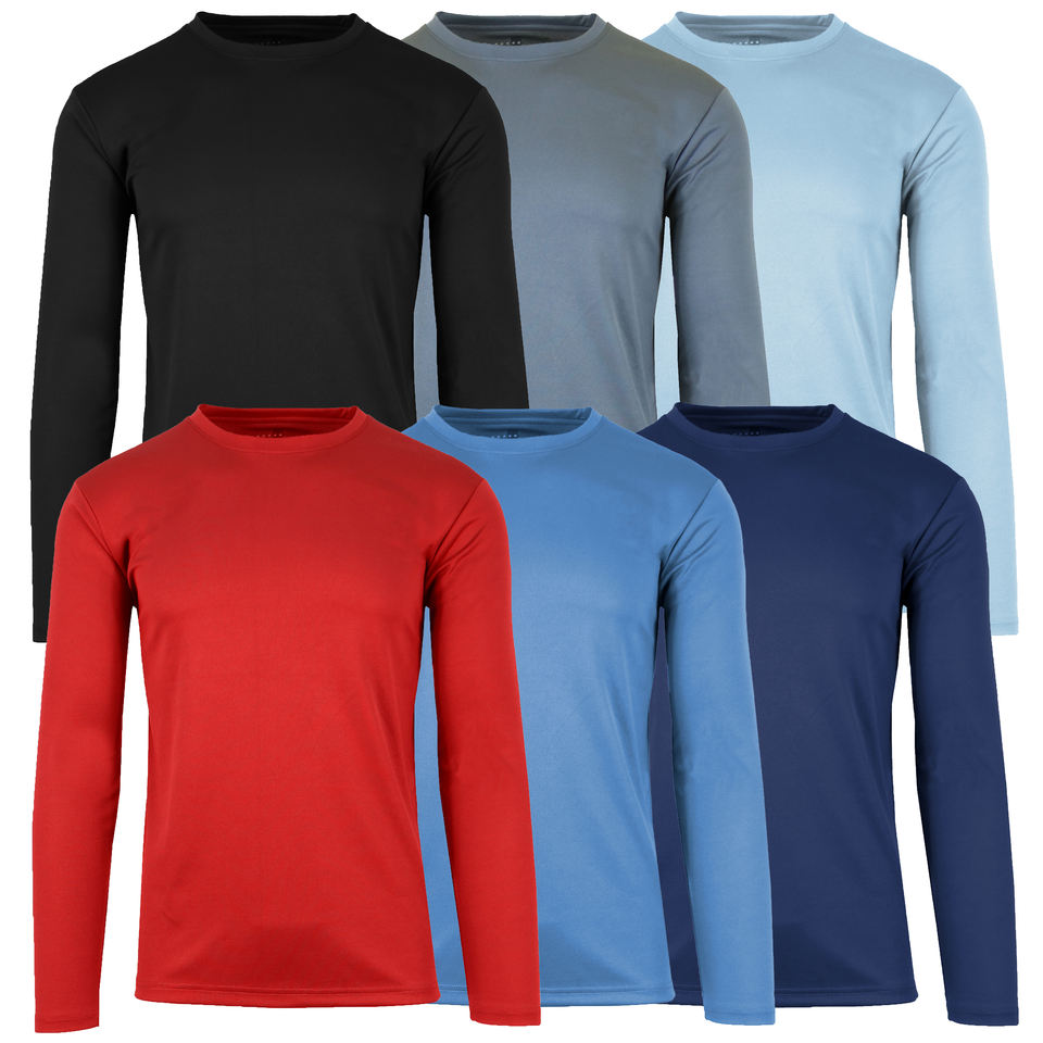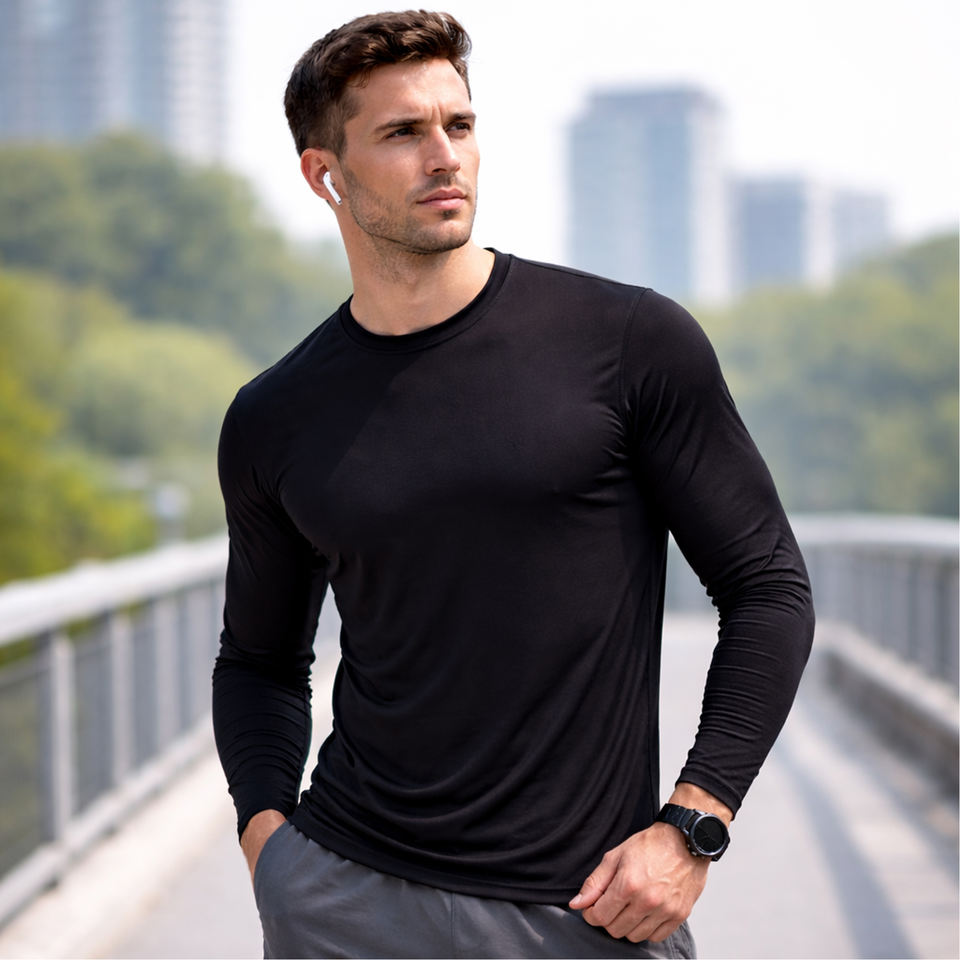 เสื้อยืดคอกลมทรงสลิมฟิตสำหรับผู้ชาย ผ้าถักเนื้อเรียบ แห้งเร็ว แขนยาว ไม่มีป้าย ผลิตจากโพลีเอสเตอร์ 100% น้ำหนัก 150 กรัม ผลิตในสหรัฐอเมริกา