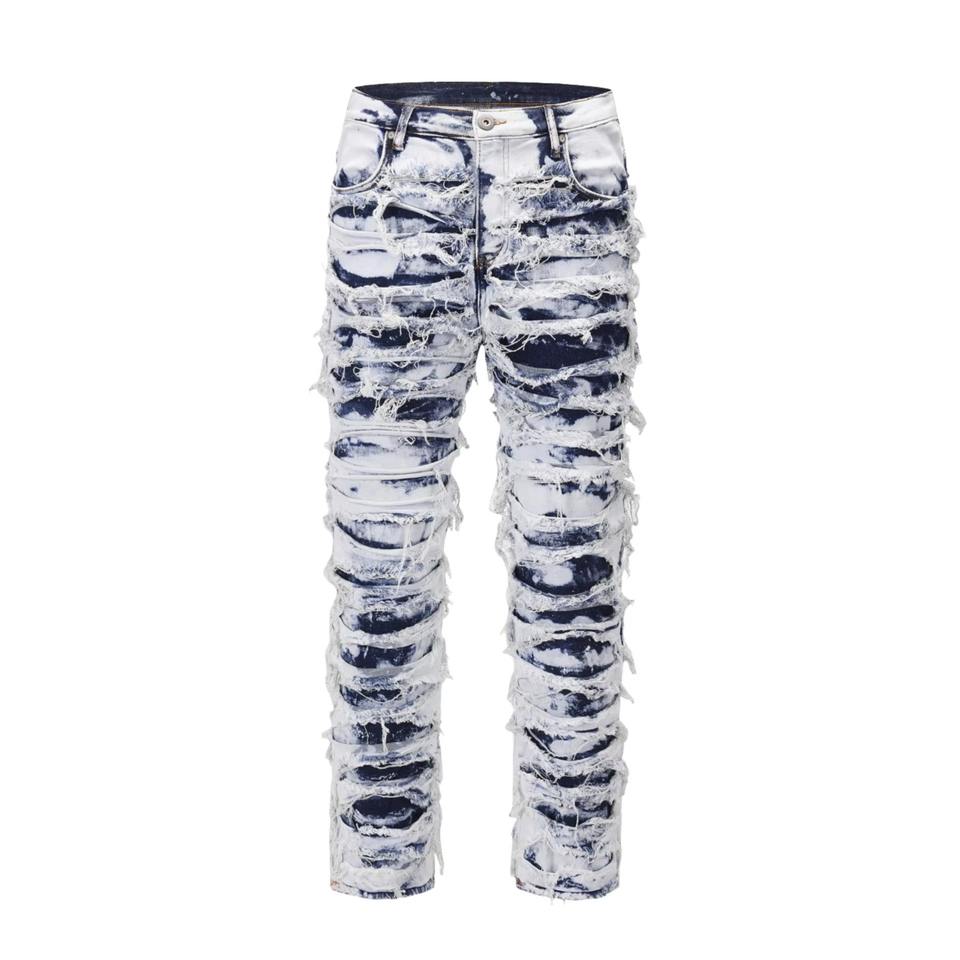 กางเกงยีนส์ทรงตรงผ้ายีนส์ฟอกสีเข้มทรงสลิมฟิตเอวกลางสำหรับผู้ชาย สไตล์ไฮสตรีท เหมาะสำหรับฤดูร้อนและฤดูใบไม้ร่วง เป็นมิตรกับสิ่งแวดล้อม ระบายอากาศได้ดี มีรอยขาด