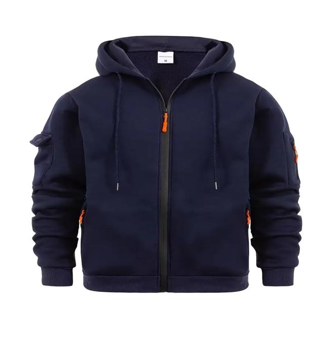 Men's Solid Color Full-Zip Hooded Fleece Sweatshirt Cardigan Multi-Pocket Design Breathable Anti-Shrink Knitted Plus Size