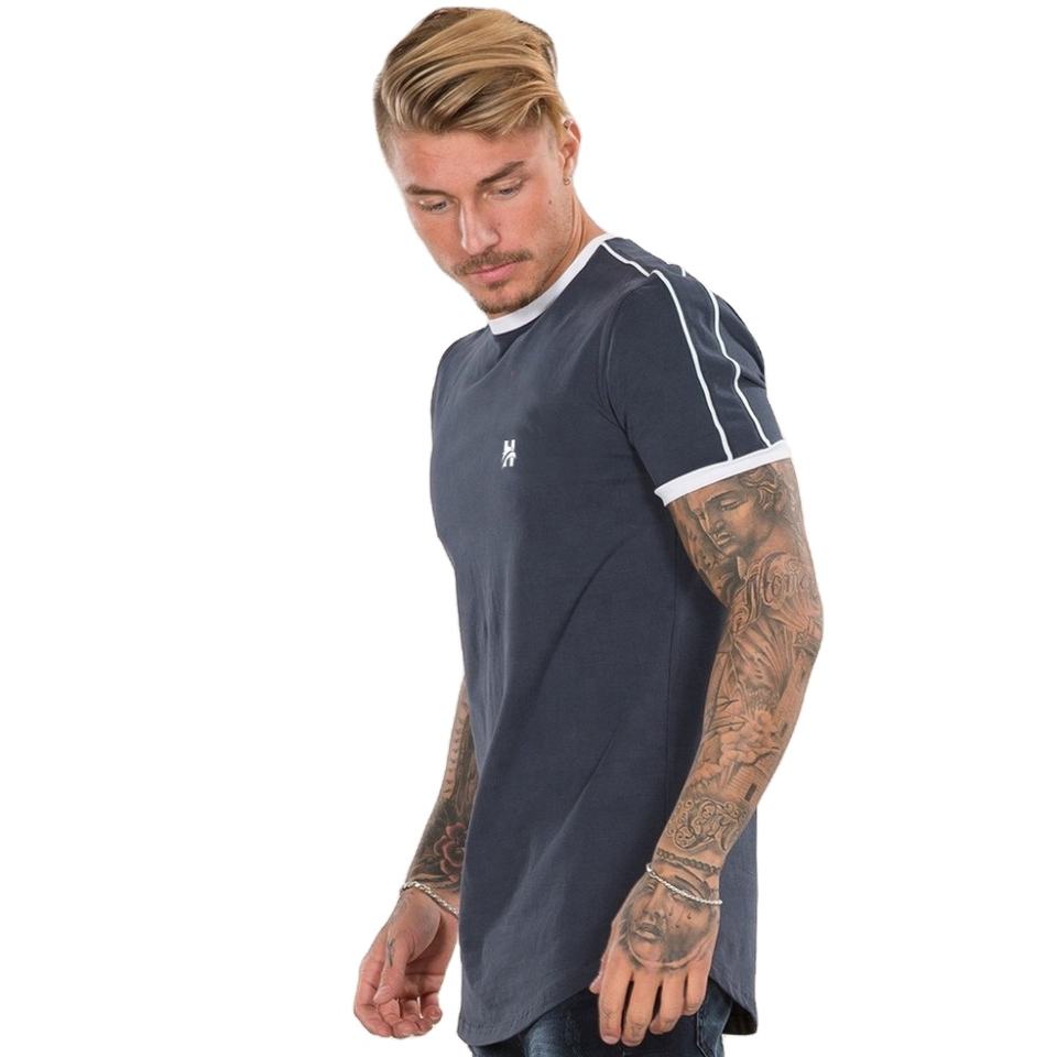 เสื้อยืดผู้ชายผ้าเจอร์ซีย์เนื้อเรียบ แขนเสื้อมีเส้นสีขาวสองเส้น ชายเสื้อโค้ง ป้องกันรอยยับ ดีไซน์ปรับแต่งได้ คอกลม 160-200 GSM ลายตาเหยี่ยว