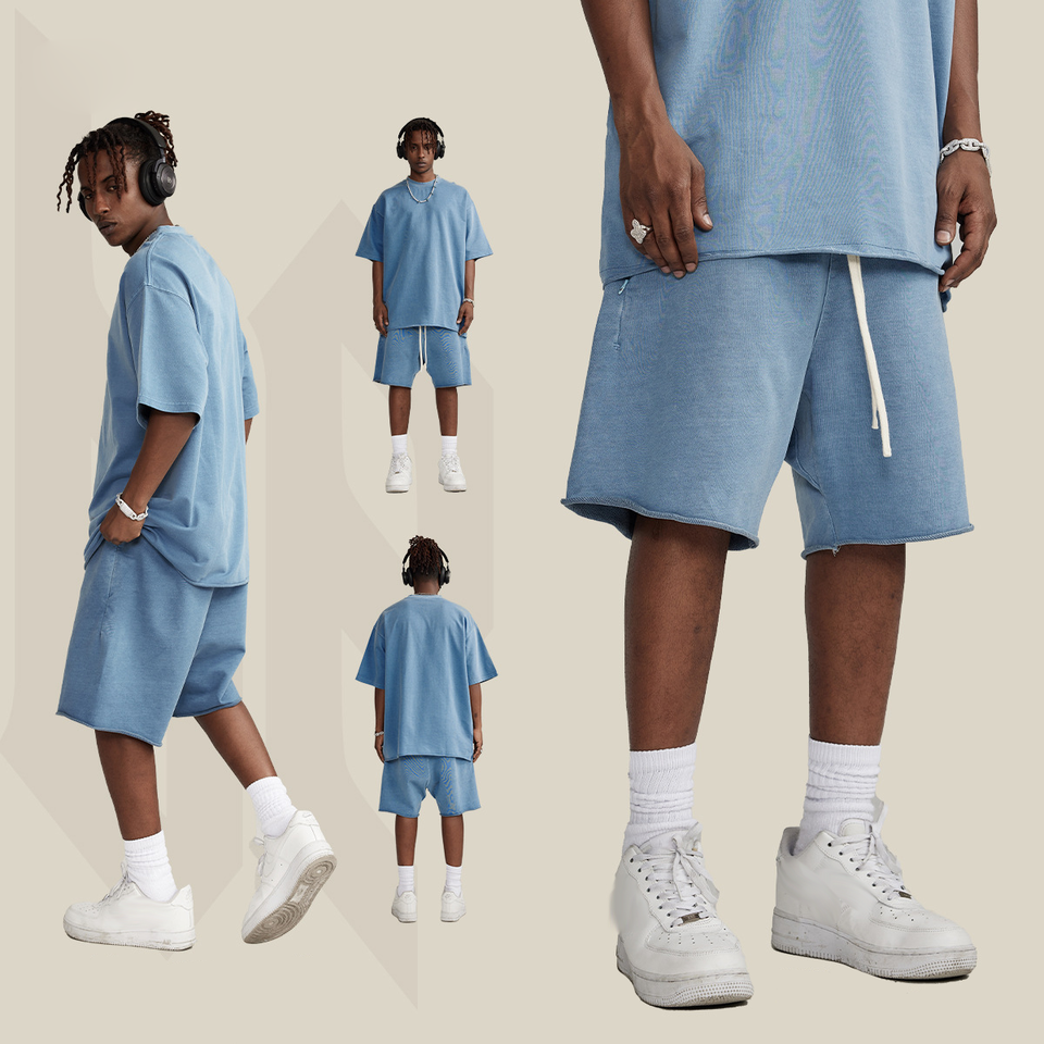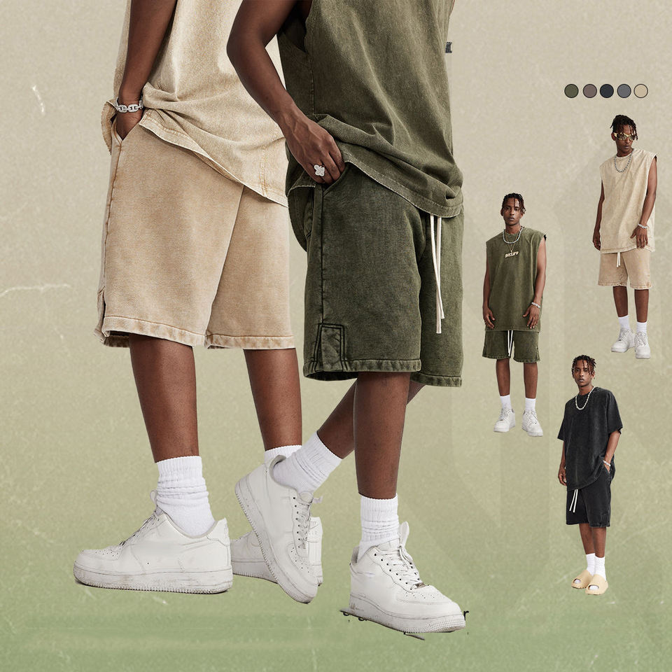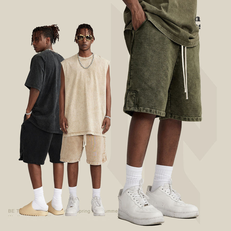 กางเกงขาสั้นผู้ชายทรงวินเทจ ระบายอากาศได้ดี ความยาวระดับเข่า เอวกลาง ผ้าฝ้าย 100% ขอบดิบ ซักย้อมสีแบบแอซิดวอช ผ้าเฟรนช์เทอร์รี่
