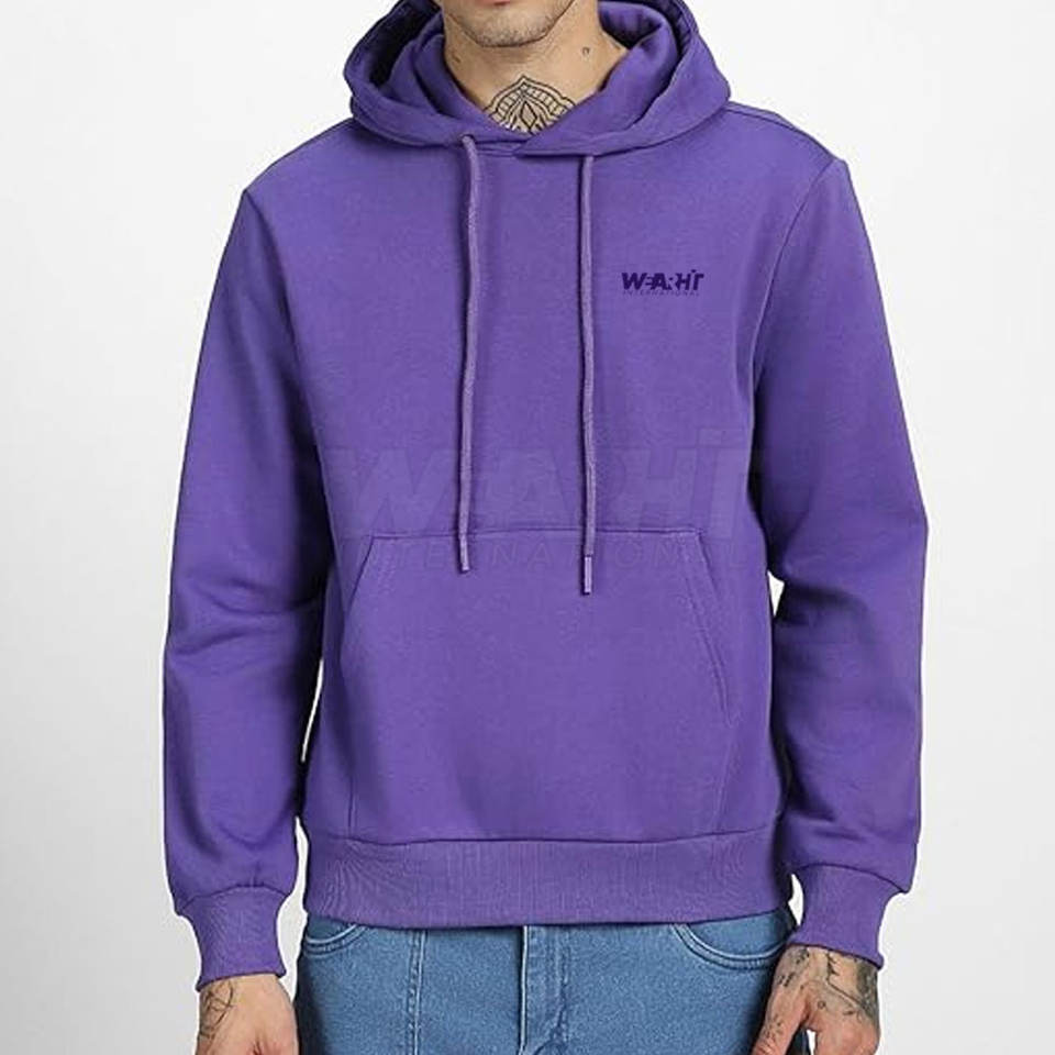 เสื้อสเวตเชิ้ตผู้ชายสีพื้นสีม่วงแบบสวมหัวมีเชือกรูดและมีกระเป๋าย้อมสีเรียบ