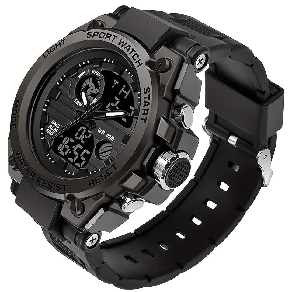 นาฬิกาข้อมือผู้ชายแบบสปอร์ตกลางแจ้ง พร้อมไฟ LED จับเวลา หน้าปัดคู่ขนาดใหญ่ แสดงผลแบบดิจิตอลและอนาล็อก สายเรซิ่น ตัวเรือน ABS กันน้ำได้ 30 บาร์