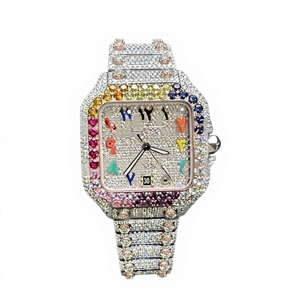 นาฬิกาข้อมือผู้ชายหน้าปัดสี่เหลี่ยมจัตุรัส ระบบออโตเมติก ตัวเรือนและสายสแตนเลสประดับโมอิสซาไนต์ กันน้ำได้ 10 บาร์ พร้อมตัวล็อคสายแบบกำไล