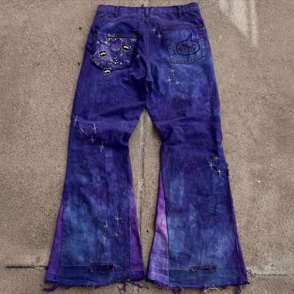 Men's Stonewashed 100% Cotton Flared Denim Pants Hip Hop Solid Distressed Jeans Crystal Mid Casual High Street Design for Autumn
