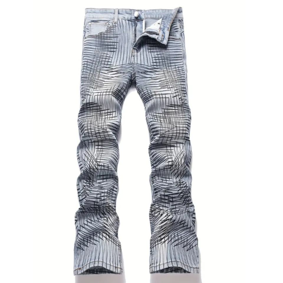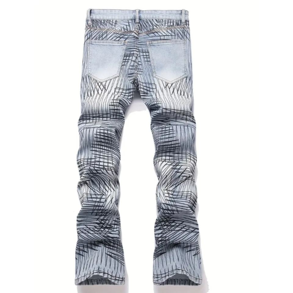 กางเกงยีนส์ทรงบานฟอกสีสไตล์สตรีทฮิปฮอป พร้อมลายพิมพ์ Chaos และงานปักสไตล์ไฮสตรีท เหมาะสำหรับลุคฮิปฮอปสตรีท