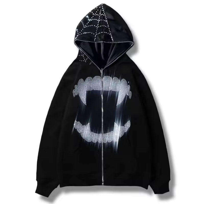 เสื้อฮู้ดสตรีทแวร์ผู้ชายสีดำ ซิปเต็มตัว ลายกราฟิกสไปเดอร์เวนอม ประดับคริสตัล ดีไซน์หนัก โลโก้ด้านหน้า
