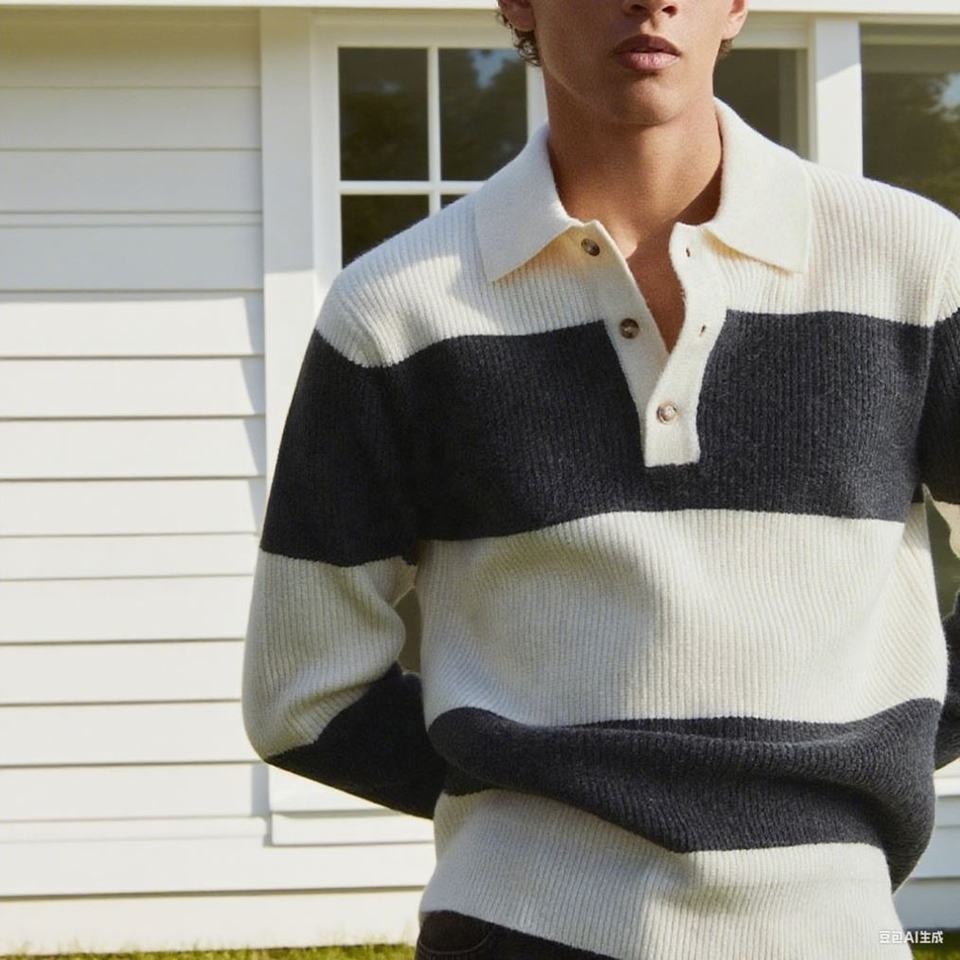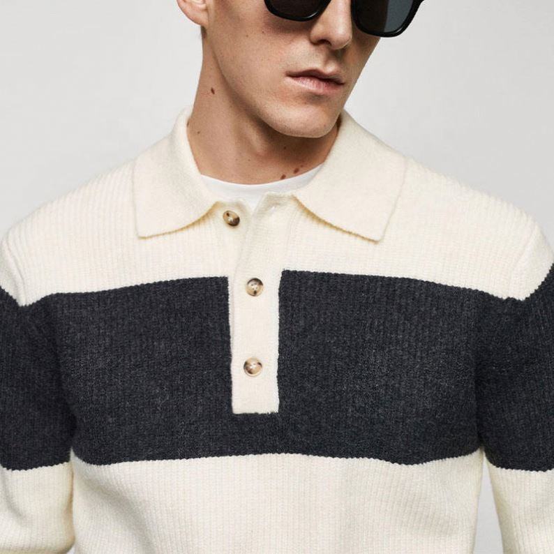 เสื้อโปโลถักลายทางเส้นเล็กสำหรับผู้ชาย กระดุมติดปก ครึ่งตาราง ลายตาราง สำหรับฤดูใบไม้ร่วงและฤดูหนาว