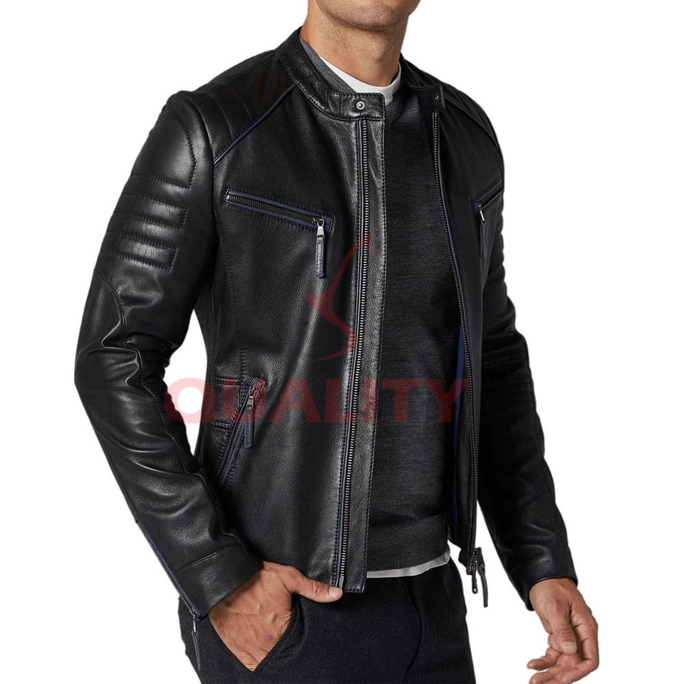 เสื้อแจ็คเก็ตหนังผู้ชายมีกระเป๋าหลายช่องคอตั้งสำหรับการผจญภัยกลางแจ้งหรือในเมือง